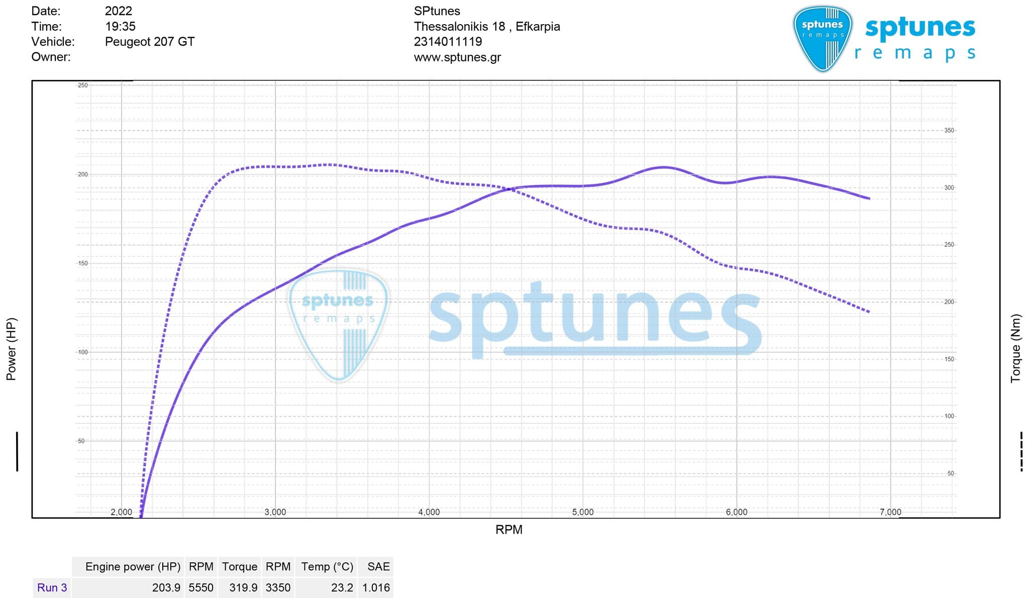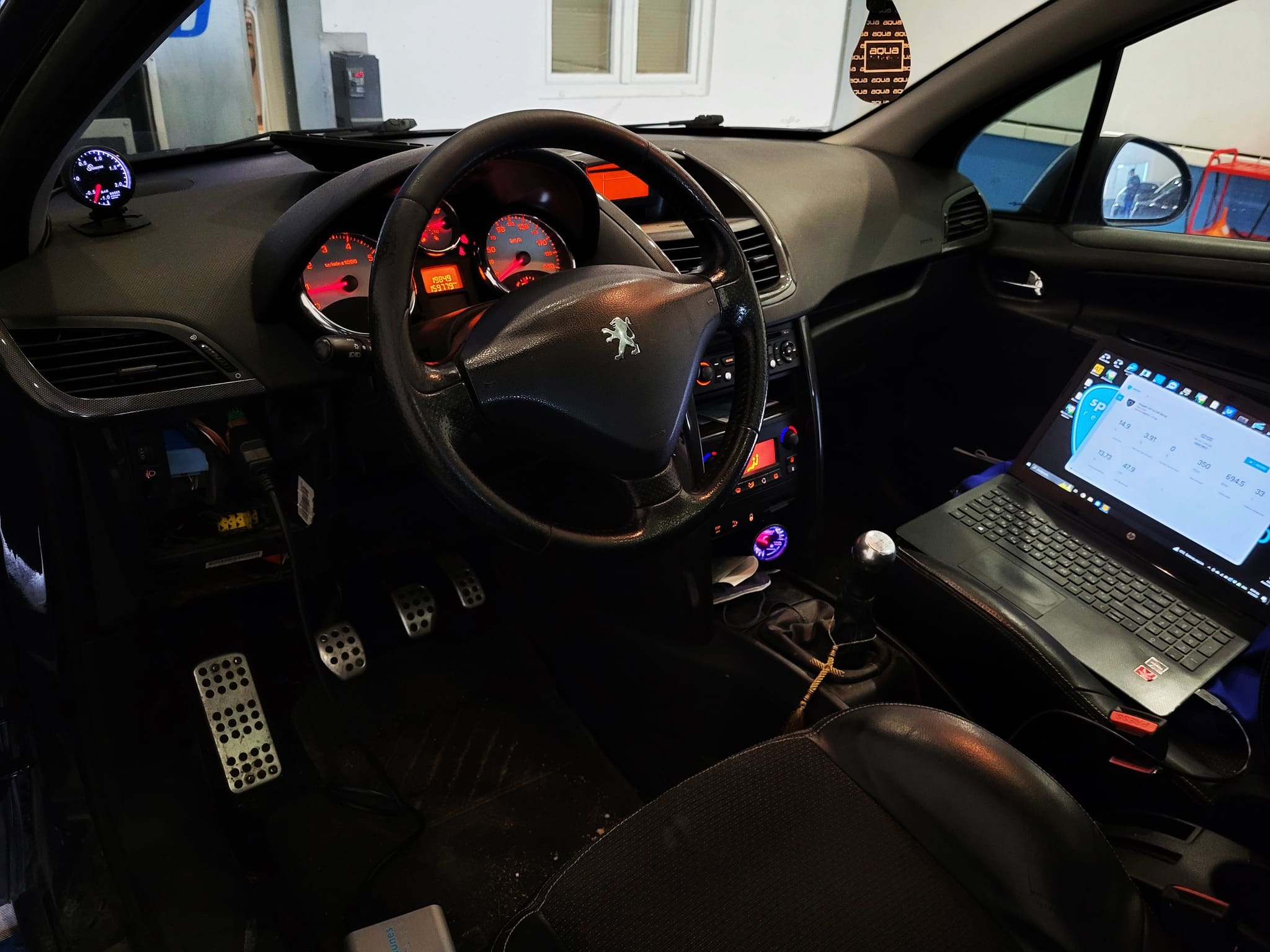 Έχουμε κάνει αμέτρητα Peugeot 207 με το γνωστό 1.6 Prince μοτέρ, που φοράνε τα Mini Cooper S, Citroen, BMW! Έτσι και ο ιδιοκτήτης μας εμπιστεύτηκε αν και ήταν ήδη προγραμματισμένο. Το μοτέρ θέλει καλή συντήρηση από επικαθήσεις στις βαλβίδες και συχνό έλεγχο στο χρόνισμα όπως και στον μεταβλητό! Ξέρουμε οτι δεν είναι από τα πιο αξιόπιστα, θέλει πολύ προσοχή στον τρόπο οδήγησης και δεν το πιέζουμε στις ρυθμίσεις. Το συγκριμένο 207 φοράει όλα τα περιφερειακά για 2ο στάδιο με Kit Εισαγωγής αέρα, intercooler και φουλ εξάτμιση! Αφού συμμαζέυτηκε λίγο μηχανικά μιας και δεν μπορούσε ούτε μαμά να κάνει πάτημα προγραμματίστηκε στο δυναμόμετρο! Με γνώμονα την αξιοπιστία, με χαμηλά EGT, μηδενικές επιστροφές knock και λάμδα στο 11.1-11.3! Το αποτέλεσμα πολύ καλό στα 204 άλογα με τρομερά καλή ροπή στο overboost χαμηλά 320 Nm, με μέγιστη πίεση 1.41 bar ενώ στον κόφτη κρατάει 0.67!