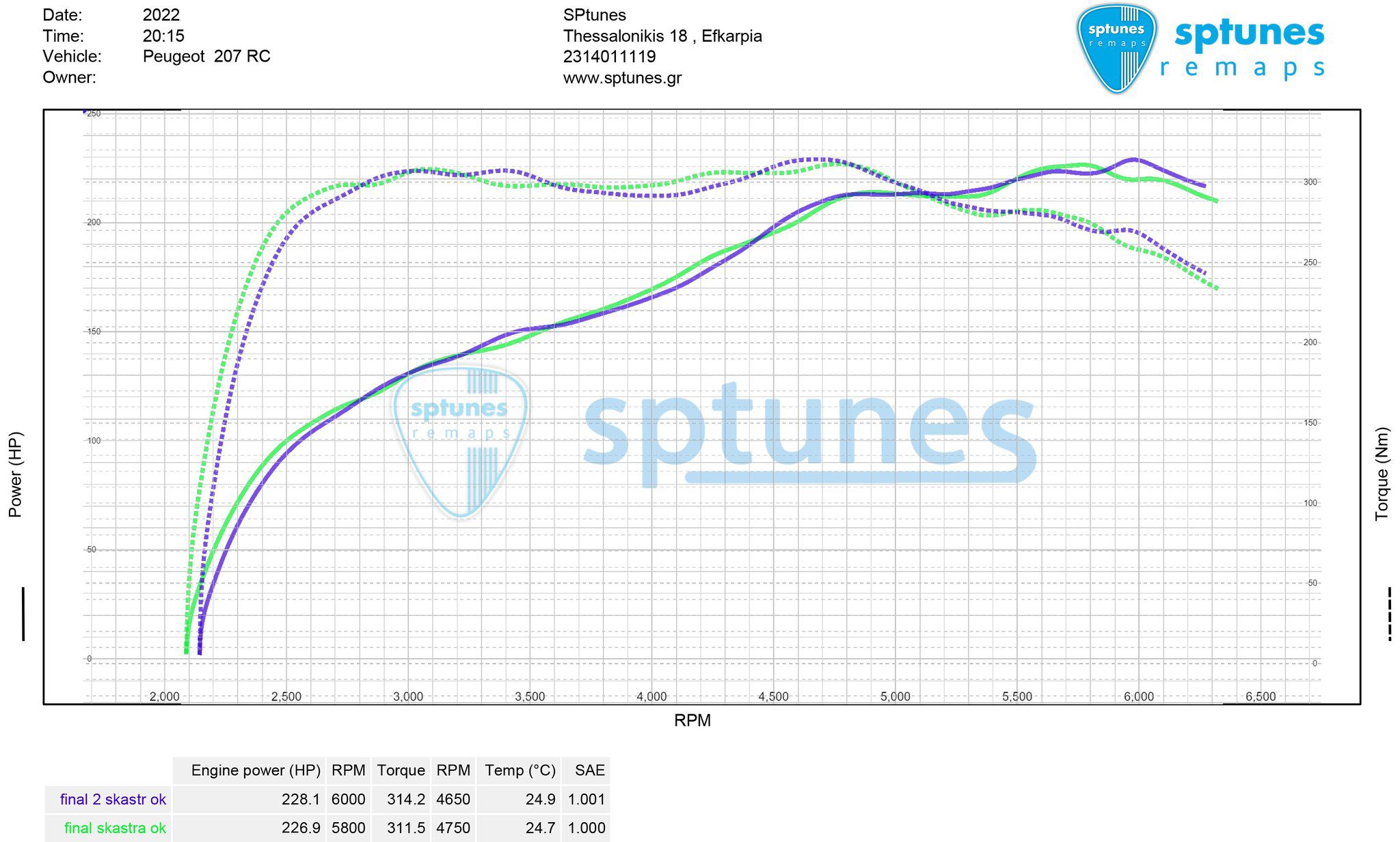 Έχουμε κάνει αμέτρητα Peugeot 207 με το γνωστό 1.6 Prince μοτέρ, που φοράνε τα Mini Cooper S, Citroen, BMW! Το μοτέρ θέλει καλή συντήρηση από επικαθήσεις στις βαλβίδες και συχνό έλεγχο στο χρόνισμα όπως και στον μεταβλητό! Ξέρουμε οτι δεν είναι από τα πιο αξιόπιστα, θέλει πολύ προσοχή στον τρόπο οδήγησης και δεν το πιέζουμε στις ρυθμίσεις. Το συγκριμένο RC φοράει όλα τα περιφερειακά για 2ο στάδιο με Kit Εισαγωγής αέρα, intercooler και φουλ εξάτμιση και η ρύθμιση για 98/100 RON βενζίνη χωρίς να το πιέσουμε! Εντωπίσαμε οτι δουλεύει άψογα, με μόνο πρόβλημα την εργοστασιακή σκάστρα, όπου την αντικαταστήσαμε με μια απο S3 8P TFSI! Με γνώμονα την αξιοπιστία, με χαμηλά EGT, μηδενικές επιστροφές knock και λάμδα στο 11.1-11.3! Το αποτέλεσμα πολύ καλό και με 1.25 πίεση over στα 228 άλογα , με πολύ γεμάτη ροπή παντού 314 Nm!