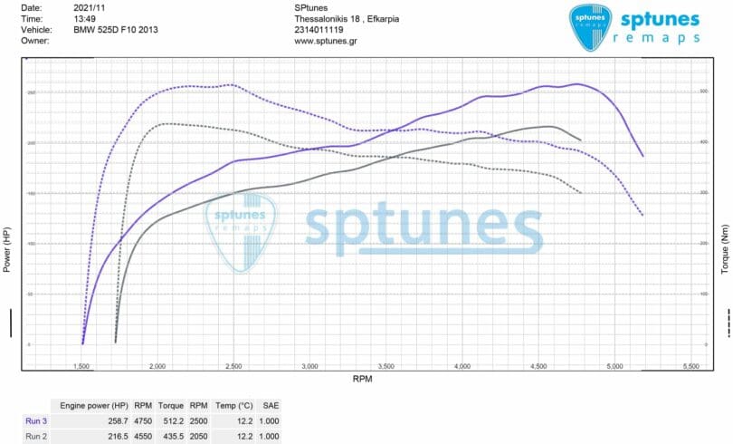 Άλλο ένα BMW με το N47 diesel μοτέρ ήρθε για προγραμματισμό. Το 525d φοράει το N47 Bi Turbo που αποδίδει 218 εργοστασιακά άλογα ενώ είναι η τετρακίνητη έκδοση xDrive! Στον προέλεγχο βρέθηκε οριακό βούλωμα στο DPF κάτι που φάνηκε και στην μετρήση μιας και απέδωσε λιγότερα απο τα εργοστασιακά άλογα, 217 ps / 436 Nm ροπής, σε σχέση με τα ονομαστικά 218 ps / 450 Nm! Μετά τον προγραμματισμό έφτασε τα 259 άλογα με τη ροπή εντυπωσιακά στα 512 Nm!