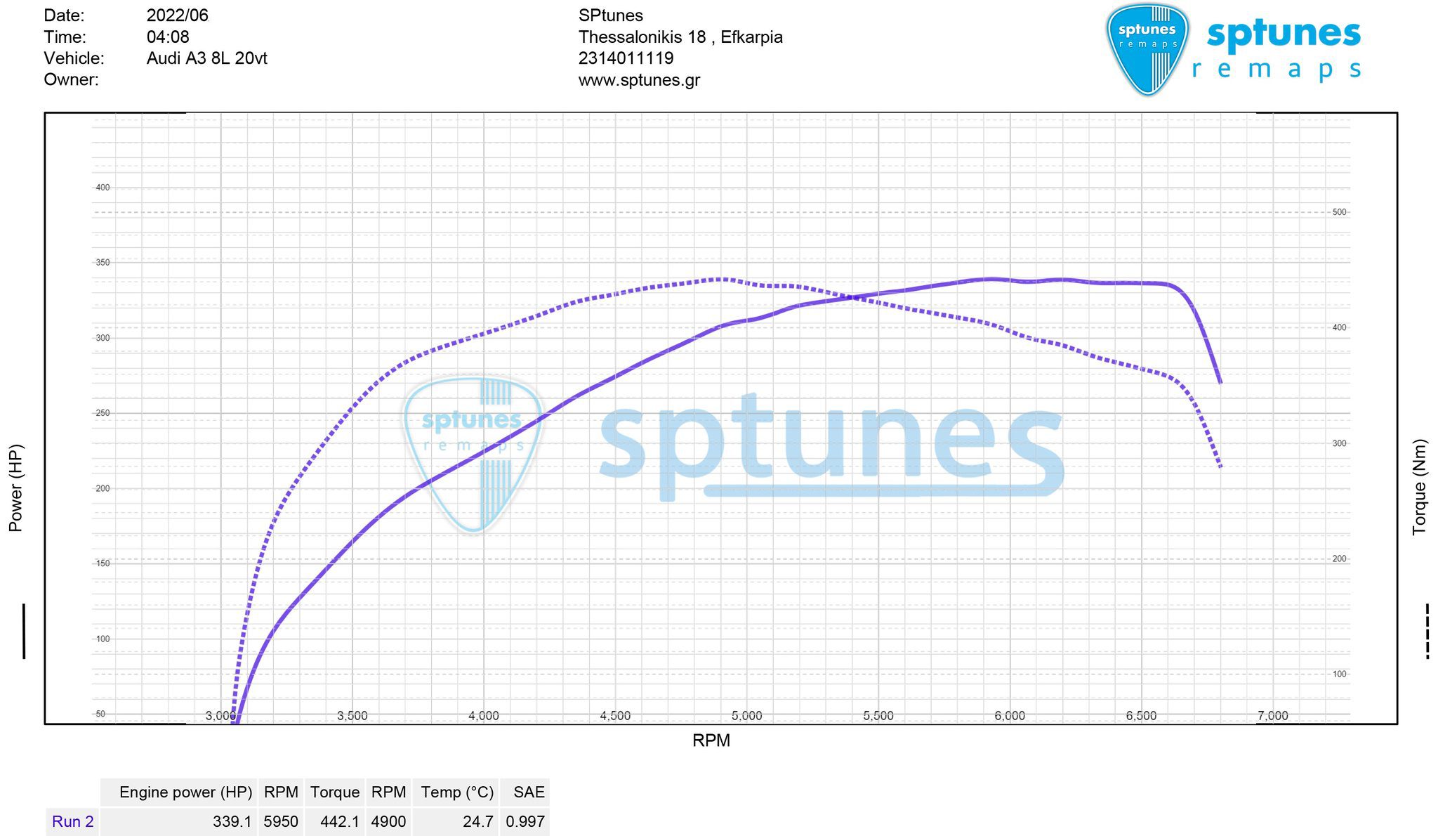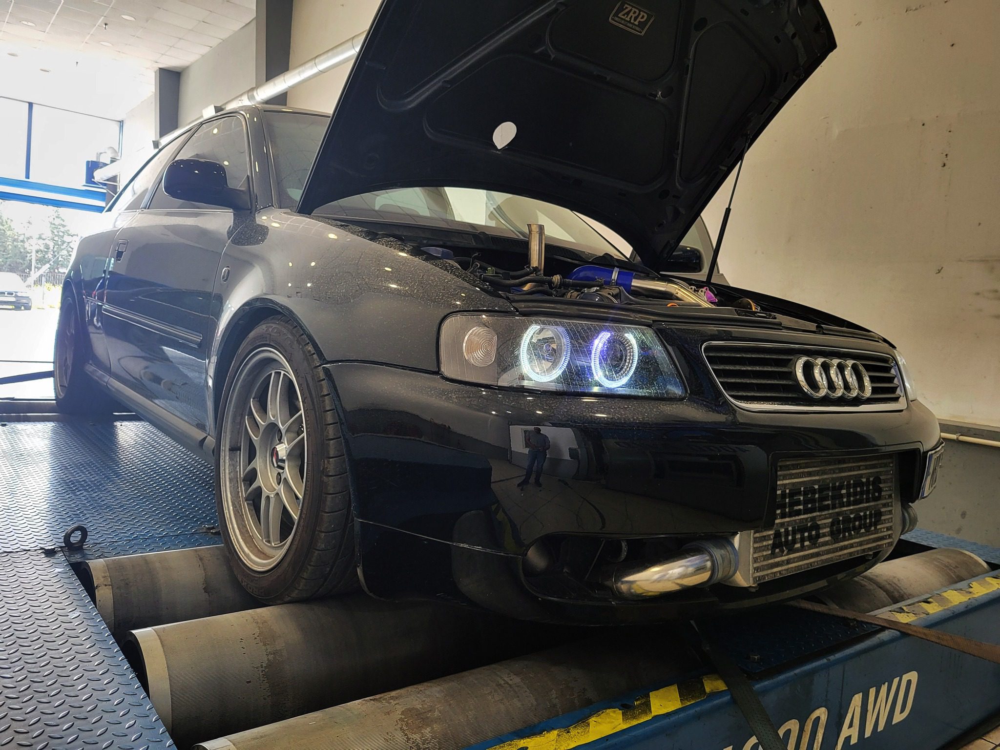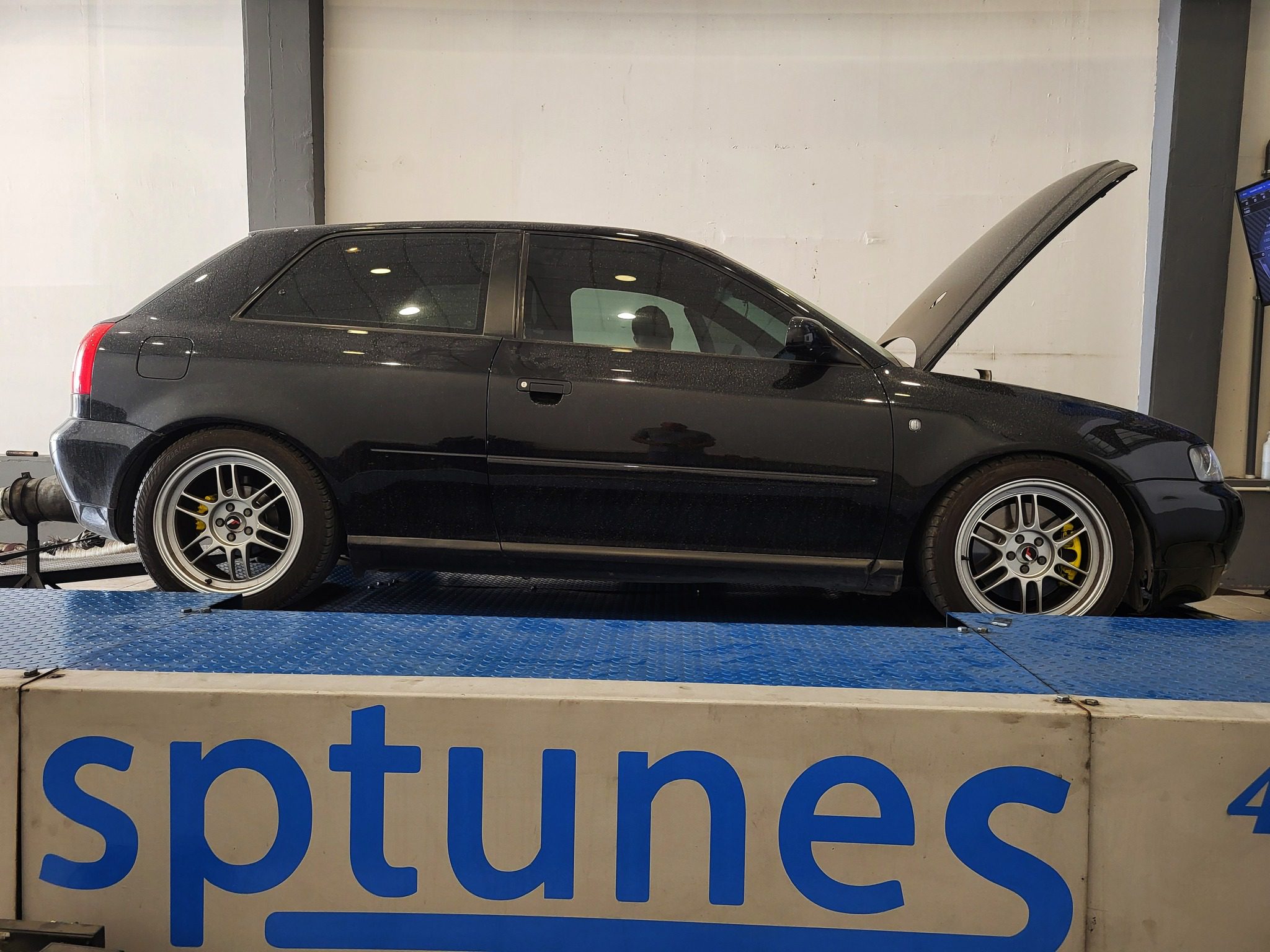 Παραδείγμα πλήρως custom setup, το οποίο προφανώς προϋποθέτει custom προγραμματισμό για την άψογη λειτουργία! Το A3 20vt το ρυθμίσαμε φοράει Turbo VF34, 550cc bosch μπεκ, Mafless με φυσικά λειτουργιό ESP και τη πίεση να διαχειρίζεται πλέον boost controller για ασφάλεια! Είναι stock μοτέρ πλην μπιελών, με εργοστασιακούς εκκεντροφόρους, πεταλούδα και πολλαπλή εισαγωγής. Με τη πίεση στο 1.6, φτάσαμε τους 339 ίππους με 442 Nm ροπής, με τη μικρή VF34 να κάνει ευχάριστο το Α3 ακόμα και στις χαμηλομεσαίες στροφές, αλλά να διατηρεί δύναμη ψηλά! 0 επιστροφές knock στους 4 κυλινδρους απόλυτα Safe για 98άρα βενζίνη. Μπεκ άψογα ρυθμισμένα, στα +- 3% trims από ρελαντί μέχρι τον κόφτη! Προσθήκη Launch Control, Flat Shift, γκαζόφρενου στον εργοστασιακό εγκέφαλο.