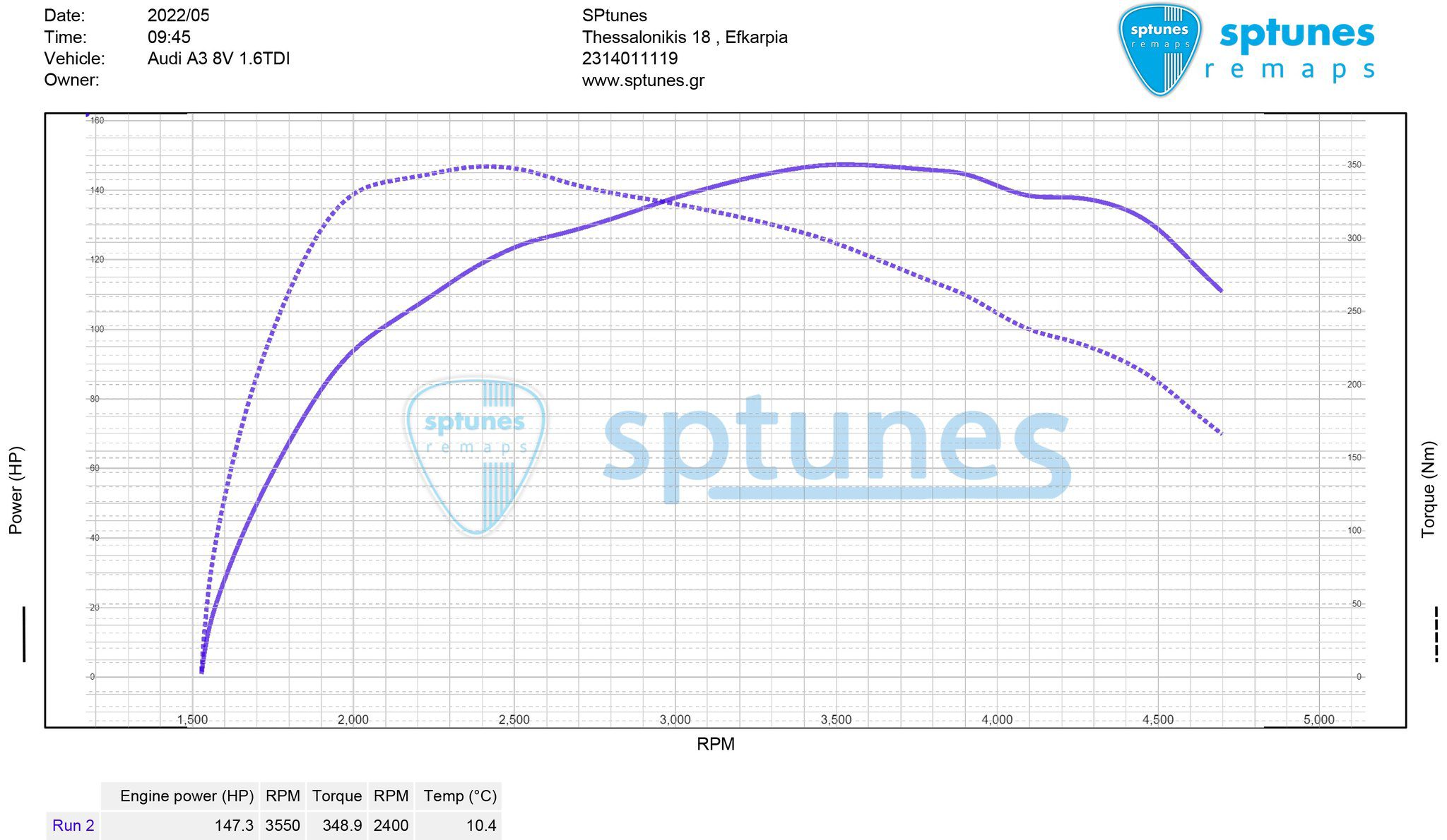 Τα 1.6 TDI VAG μοτέρ τα έχουμε εξελίξει απο 1ο στάδιο μέχρι και με υβριδικά turbo ή και turbo από 2.0 TDI. Το A3 8V φοράει τον CXXB κινητήρα με τους 110 ίππους! Πάντα κάνουμε έναν καλό προέλεγχο για τη σωστή λειτουργία του κινητήρα αλλά και τη συγκέντρωση ποσότητας soot στο DPF. Το A3 ήταν άψογο με πολύ καθαρό φίλτρο μικροσωματιδίων και προχωρήσαμε στον προγραμματισμό. Τελικό αποτέλεσμα 147 ίπποι και ροπή στα 349 Nm , με μηδενική “κάπνα” πίσω!