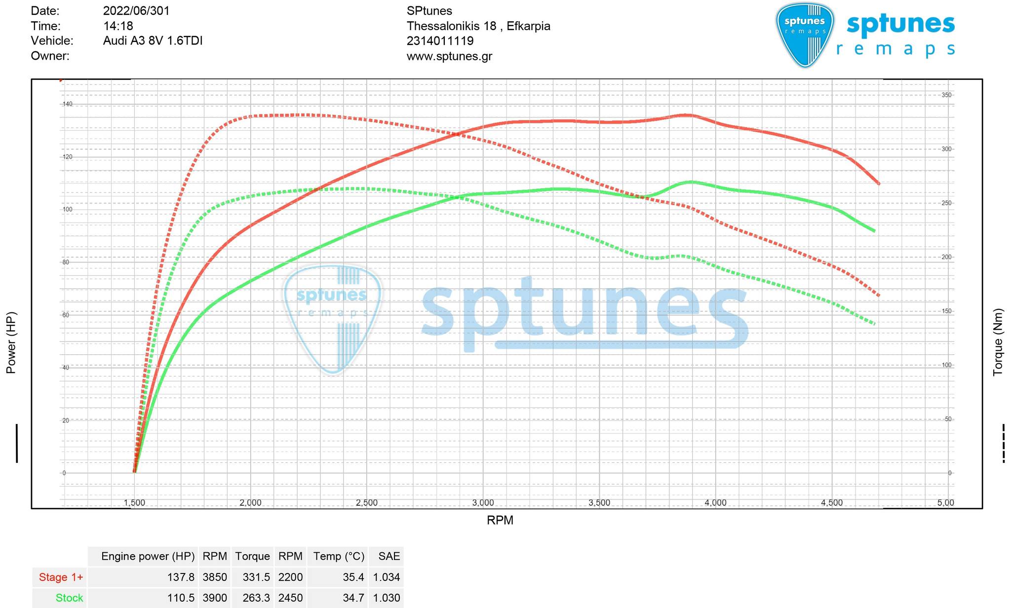 Τα 1.6 TDI VAG μοτέρ τα έχουμε εξελίξει απο 1ο στάδιο μέχρι και με υβριδικά turbo ή και turbo από 2.0 TDI.Το συγκεκριμένο A3 8V φοράει τον 1.6 TDI CLH κινητήρα με τους 110 ονομαστικούς ίππους, που βγήκε αμέσως μετά τη “Dieselgate” εποχή! Ανακαλύψαμε οτι ήταν ήδη “ελαφρώς” βουλωμένο το φίλτρο μικροσωματιδίων DPF, χωρίς όμως να μας επηρεάσει ιδιαίτερα, ίσως με λίγο πιο κομμένη απόδοση. Μετά τον προγραμματισμό έφτασε τους 138 ίππους με άφθονη πλέον ροπή 331 Nm, χωρίς “πετσόκομα” στους αισθητήρες πυρομέτρου, μηδενική κάπνα και όλες τις δικλείδες ασφαλείας.