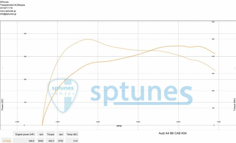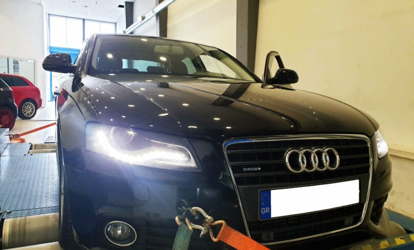 Ο CAB κινητήρας είναι ο πρώτης γενιάς 1.8 TSI/TFSI EA888 της VW. Πρόκειται για το ίδιο μοτέρ με τα γνωστά BZB/BYT με κάποιες διαφορές στα ηλεκτρονικά, όπως και ο επόμενος EA888 Gen 2 CDA, CDH κλπ. Το Α4 φόρεσε Turbo K04064, μπεκ απο Golf VI Gti και μαζί με τα περιφερειακά του ήρθε για προγραμματισμό. Χωρίς να το πιέσουμε ιδιαίτερα με την εργοστασιακή Ν75 και εργοστασιακές βαβλίδες, έφτασε τα 347 άλογα με ροπή κοντα στα 500 Nm! Σύντομα με Boost Controller για καλύτερη διαχείρηση πίεσης και άλλες βαλβίδες θα μπορέσει να φτάσει τα 370++ όπως έχουμε δείξει σε άλλα post απο αντίστοιχα μοτέρ.