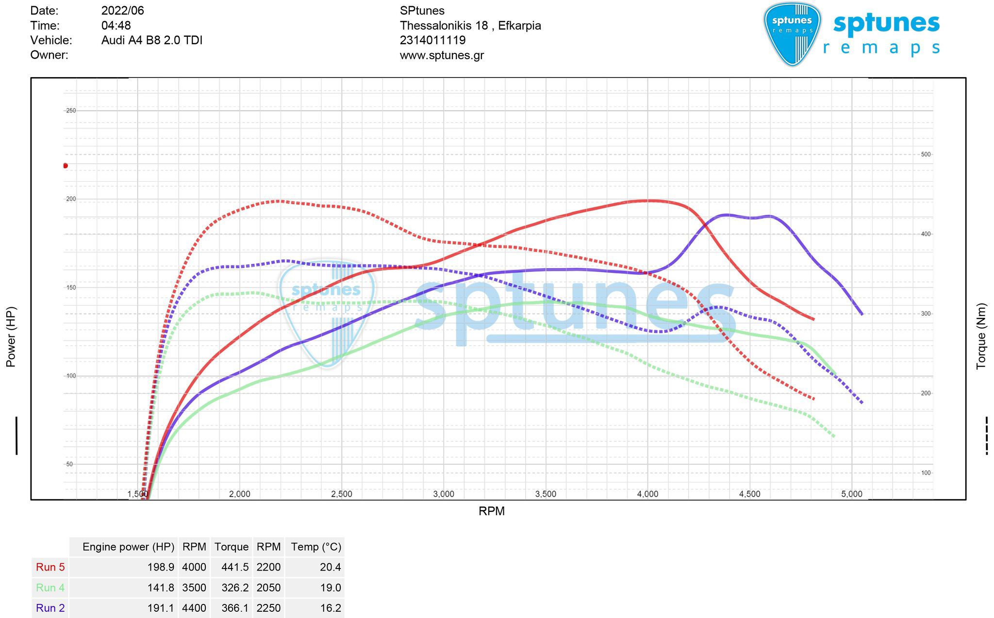 Προσοχή και πάλι στα “πρώτα” στάδια, έχουμε ανεβάσει πολλά post, οτι δεν είναι όλα ίδια! Το A4 B8.5 εφοδιάζεται με τον 2.0 TDI κινητήρα CJC με τους 143 ονομαστικούς ίππους και ήρθε για έλεγχο αρχικά μιας και δε δούλευε καλά. Ήταν ήδη προγραμματισμένο και όταν το ανεβάσαμε διαπιστώσαμε οτι τα μπεκ είχαν τεράστιο ψεκασμό, και πίεση/ροπή ερχόταν σε λάθος σημείο. Ενώ έβγαλε 191 ίππους με 366 Nm ροπής, φαίνεται (μπλε διάγραμμα), πως έρχονται τα άλογα σε ψηλές στροφές, με πολύ ψεκασμό κάτι που μακροπρόθεσμα θα δημιουργούσε θέμα. Έγινε εργοστασιακό, έγινε έλεγχος στα μπεκ και προχωρήσαμε εκ νέου σε δυναμομέτρηση για να διαπιστώσουμε πόσο λειτουργικό είναι το Α4. Εργοστασιακά απέδωσε 142 ίππους με 326 Nm ροπής απο τα 143 με 320 Nm που δηλώνει ο κατασκευαστής με ένα υγειέστατο διάγραμμα και έτσι προχωρήσαμε στον προγραμματισμό. Τελικό αποτέλεσμα 199 ίπποι, ολοζώντανοι με ροπή απο χαμηλά στα 441 Nm με πολύ μεγάλο φάσμα όπως φαίνεται και απο το κόκκινο διάγραμμα!