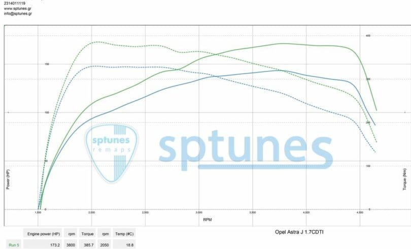 Opel Astra J 1.7 CDTI ecoFLEX (A17DT) Free flow exhaust 130 ps (measured 140 ps) ——-> 173 ps 300 Nm (measured 325 Nm) —–> 387 Nm Το Astra J εφοδιάζεται με τον 1.7 CDTI με τα 130 εργοστασιακά άλογα. Τοποθέτησε πιο ελεύθερη εξάτμιση και ήρθε για προγραμματισμό. Το αποτέλεσμα πολύ καλό με ροπή σε όλο το φάσμα σχεδόν 6 κιλά επάνω!