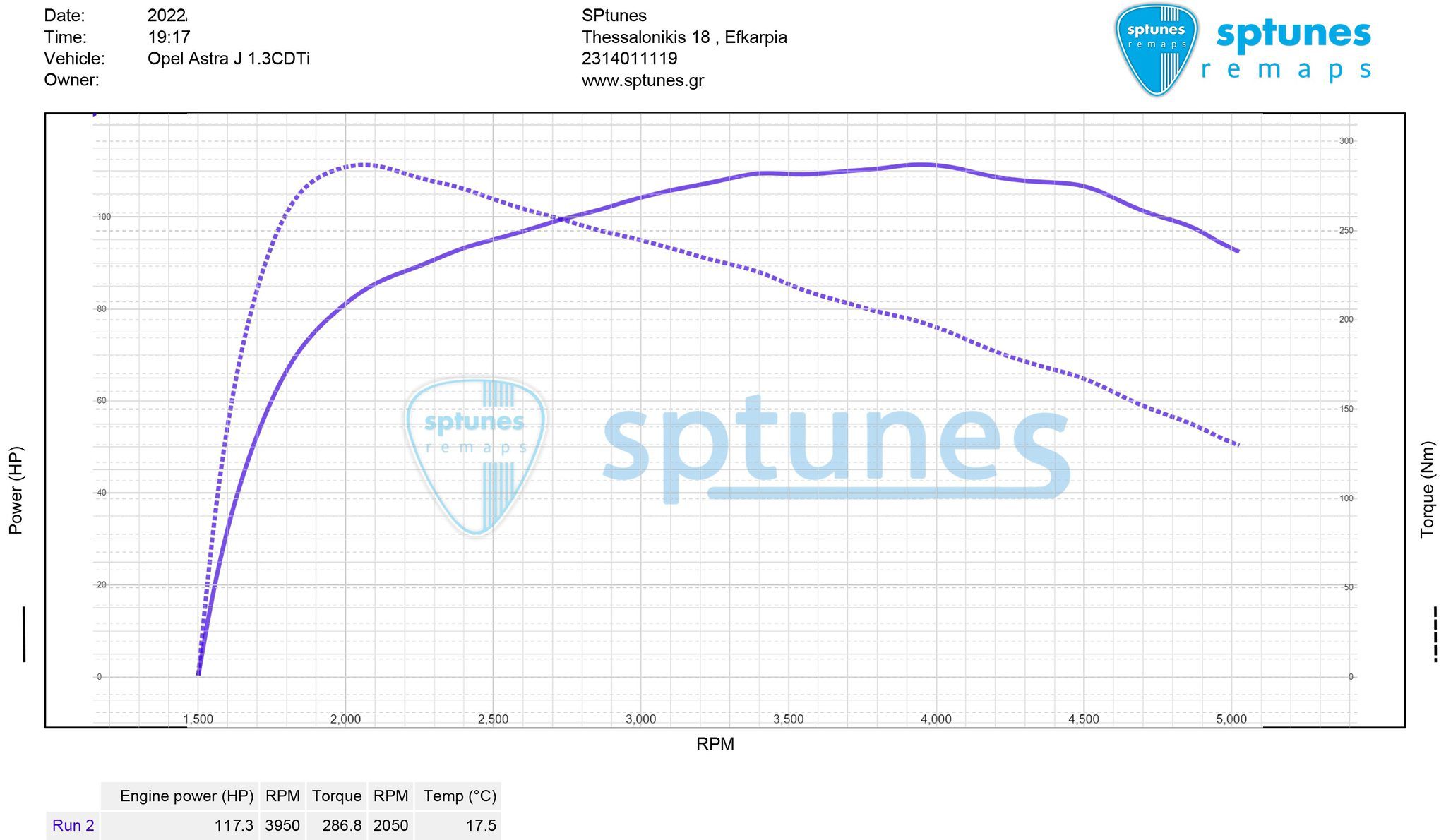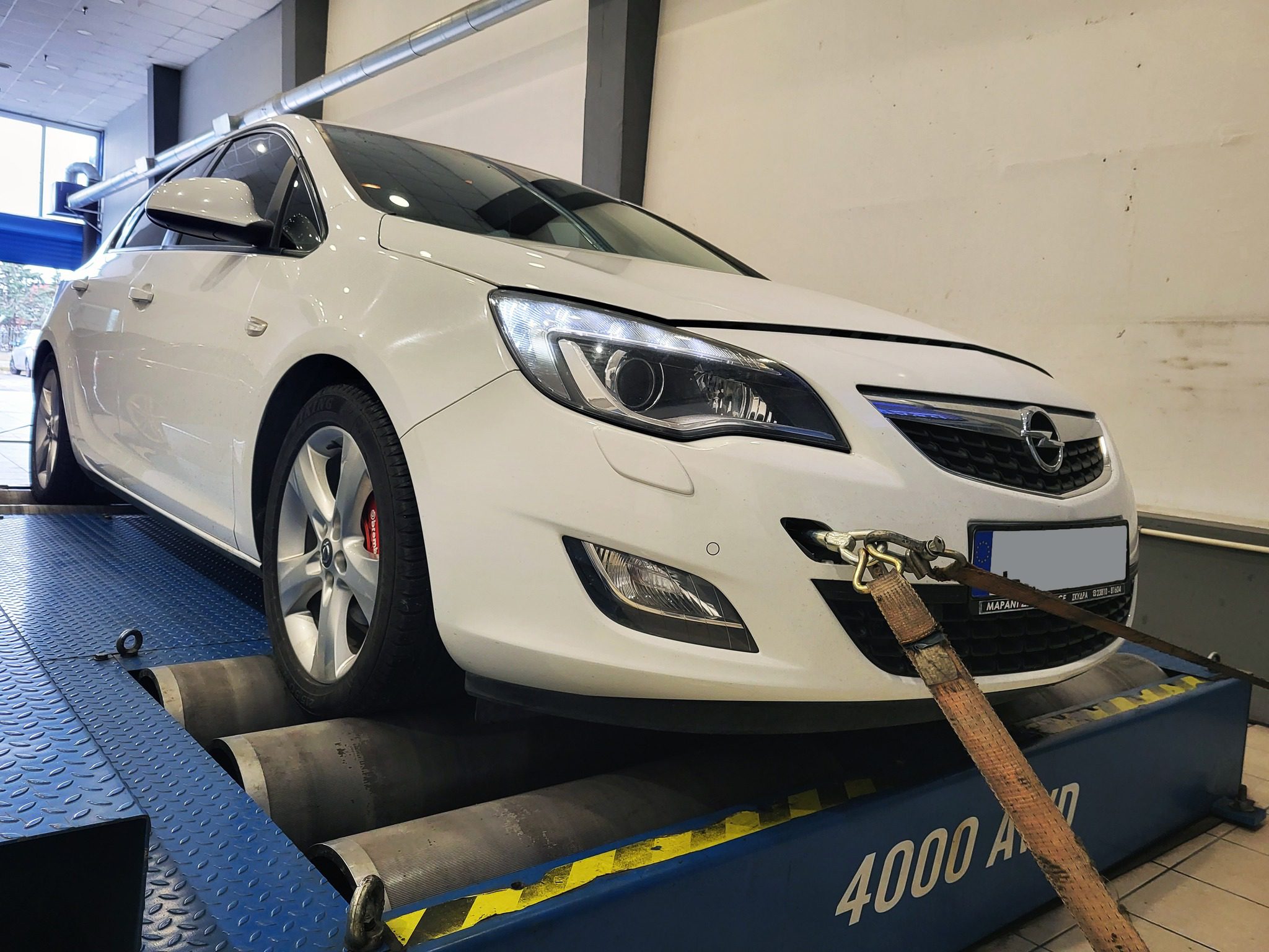 Το Astra J εφοδιάζεται με τον 1.3 CDTI της Fiat με τα 95 εργοστασιακά άλογα. Τα Α13DT μοτέρ αποδίδουν πολύ καλά με άφθονη ροπή και μόνο περιορισμό την αρκετά σφιχτή εξάτμιση. Το συγκεκριμένο Astra είχε παράλληλο εγκεφαλάκι, το οποίο απέδιδε μέν, είχε αρκετή κάπνα δε, το οποίο μακροπρόθεσμα θα δημιουργούσε πρόβλημα στο φίλτρο μικροσωματιδίων, το Turbo καθώς και τη μηχανή! Έτσι αφαιρέθηκε, έγινε προέλεγχος και αφού βρήκαμε ελάχιστο “βούλωμα” στο φίλτρο μικροσωματιδίων DPF, προχωρήσαμε στον προγραμματισμό στο δυναμόμετρο. Τελικό αποτέλεσμα 117 ίπποι και ροπή στα 287 Nm στο peak, με μηδενική κάπνα και 100% safe για το DPF.