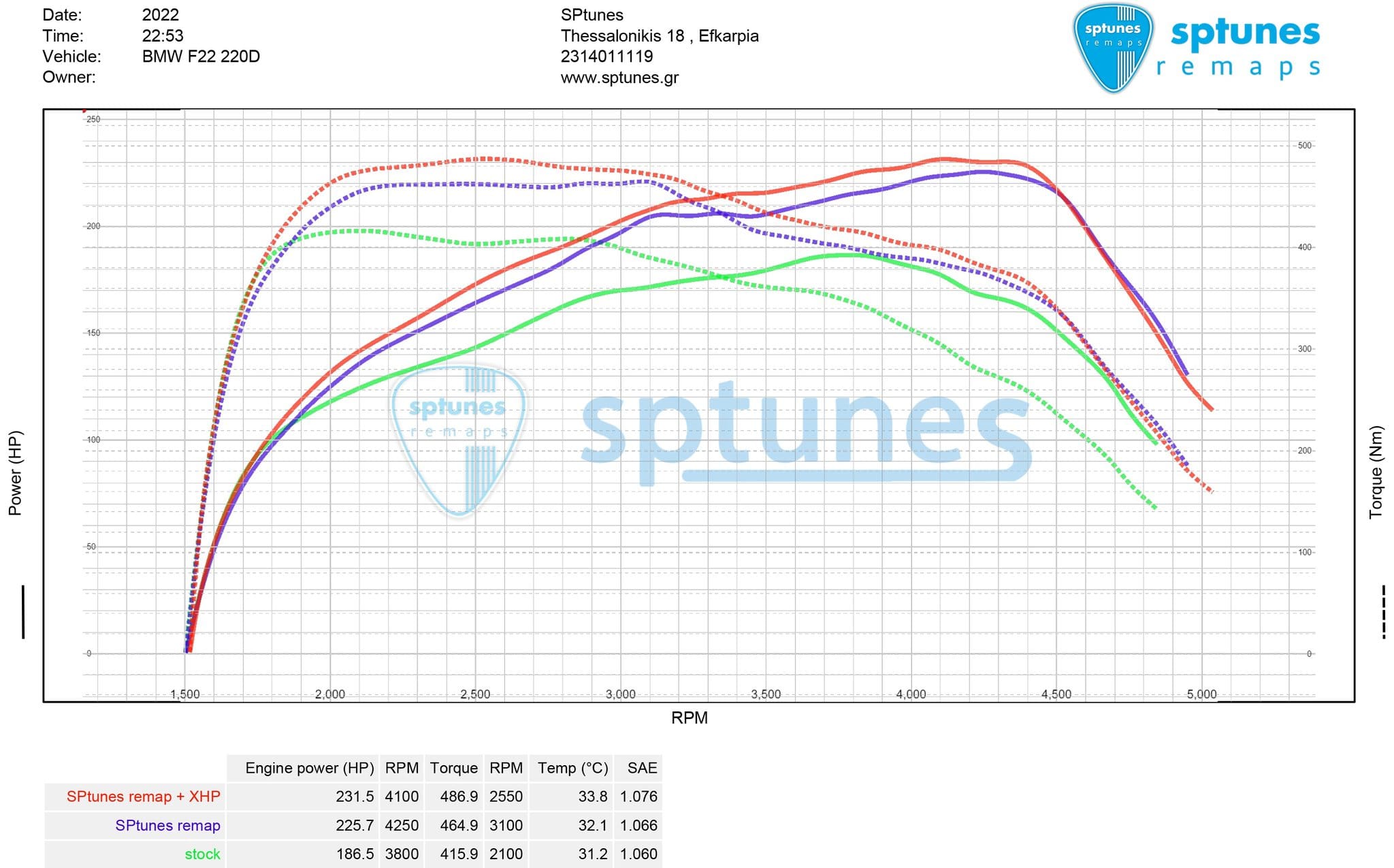 Έχουμε κάνει αμέτρητα N47 και B47 Diesel μοτέρ στα BMW με πολύ καλά αποτελέσματα μιας και είναι απο τα πιο αξιόπιστα στον χώρο! Αυτή τη φορά έχουμε ένα όμορφο 220d Coupe αυτόματο τετρακίνητο xDrive! Ο μερακλής ιδιοκτήτης φόρεσε ελεύθερη εξάτμιση μέχρι πίσω 63.5mm απο το downpipe και ήρθε για προγραμματισμό. Εργοστασιακό δυναμομετρήθηκε στους 186 ίππους, 4 ίππους κάτω απο την ονομαστική δύναμη, κάτι συνηθισμένο όμως στα B47. Αφού διαπιστώσαμε ότι είναι πλήρως λειτουργικό προχωρήσαμε στον custom προγραμματισμό στο δυναμόμετρο! Ο πελάτης επέλεξε το πλήρες πακέτο με πρόγραμμα σασμάν xHP Stage 3, για πολύ πιο γρήγορες αλλαγές, launch control και αφαίρεση του κόφτη ροπής για μέγιστα αποτελέσματα. Έτσι το τελικό μας αποτέλεσμα έφτασε τους 231.5 ίππους με άφθονη και απροβλημάτιστη ροπή στα 487 Nm. Να σημειώσουμε οτι τα πυρόμετρα δουλεύουν κανονικά, οι δικλείδες ασφαλείας επίσης και έχουμε μηδενική “κάπνα” κατά το πάτημα.