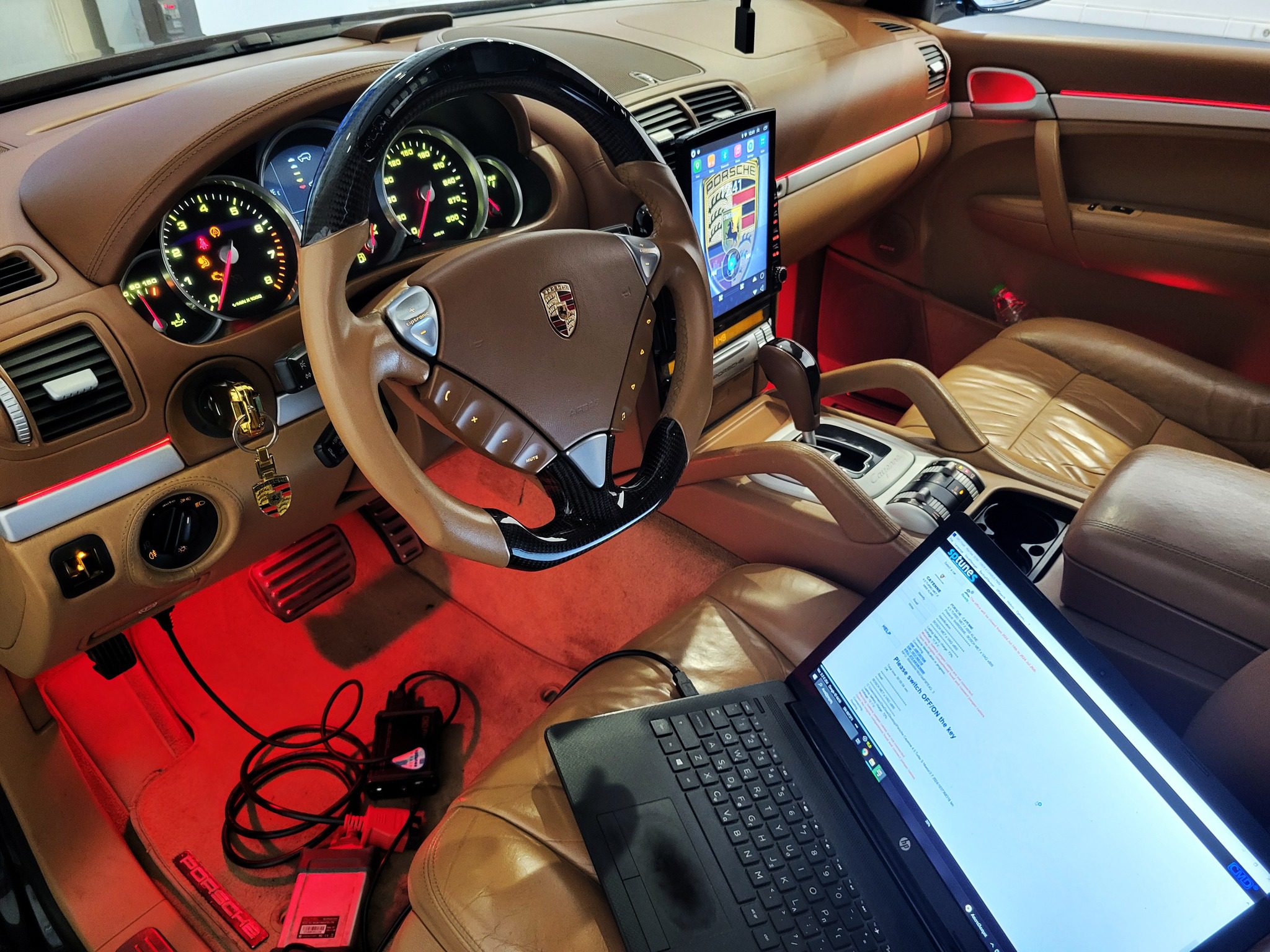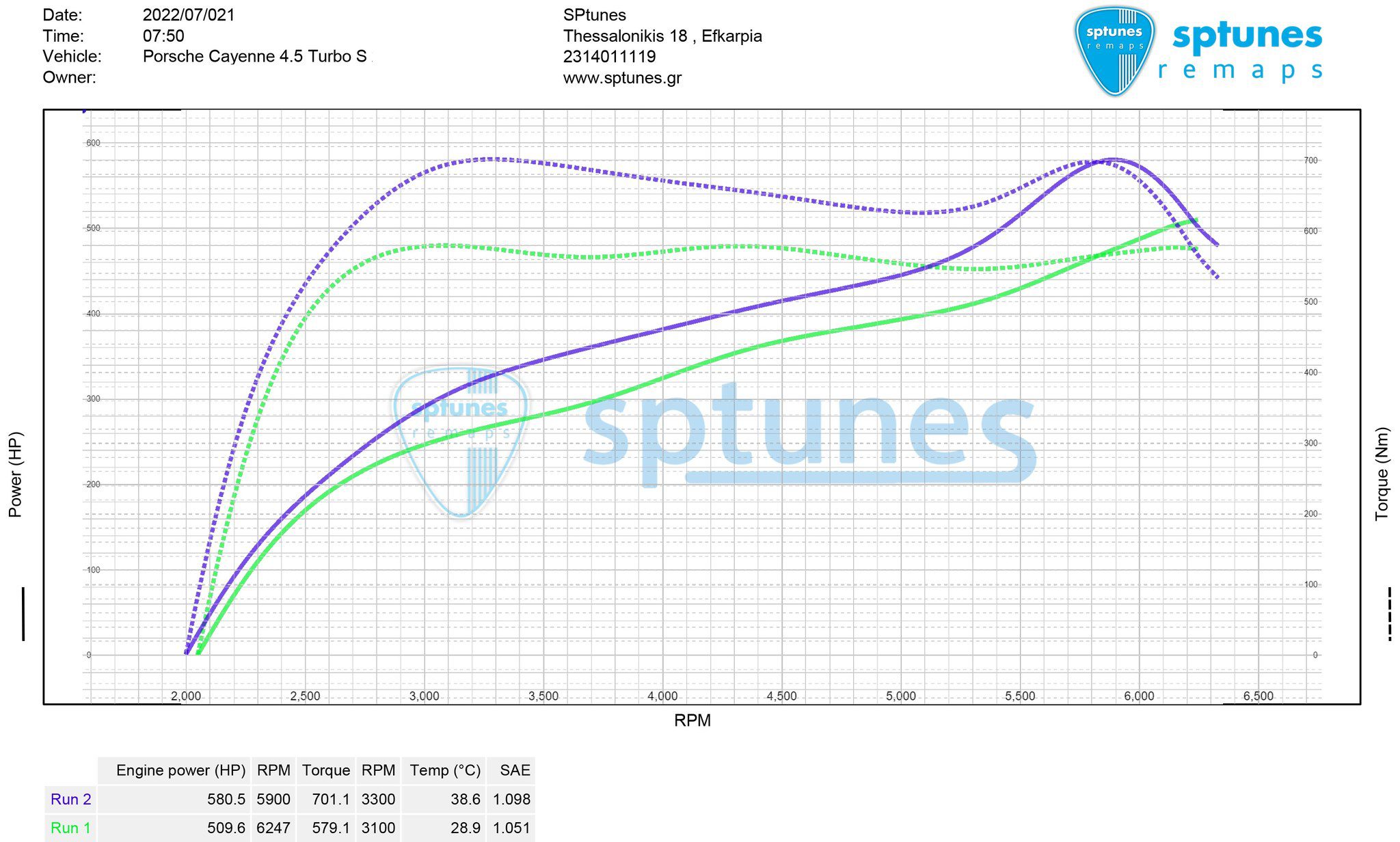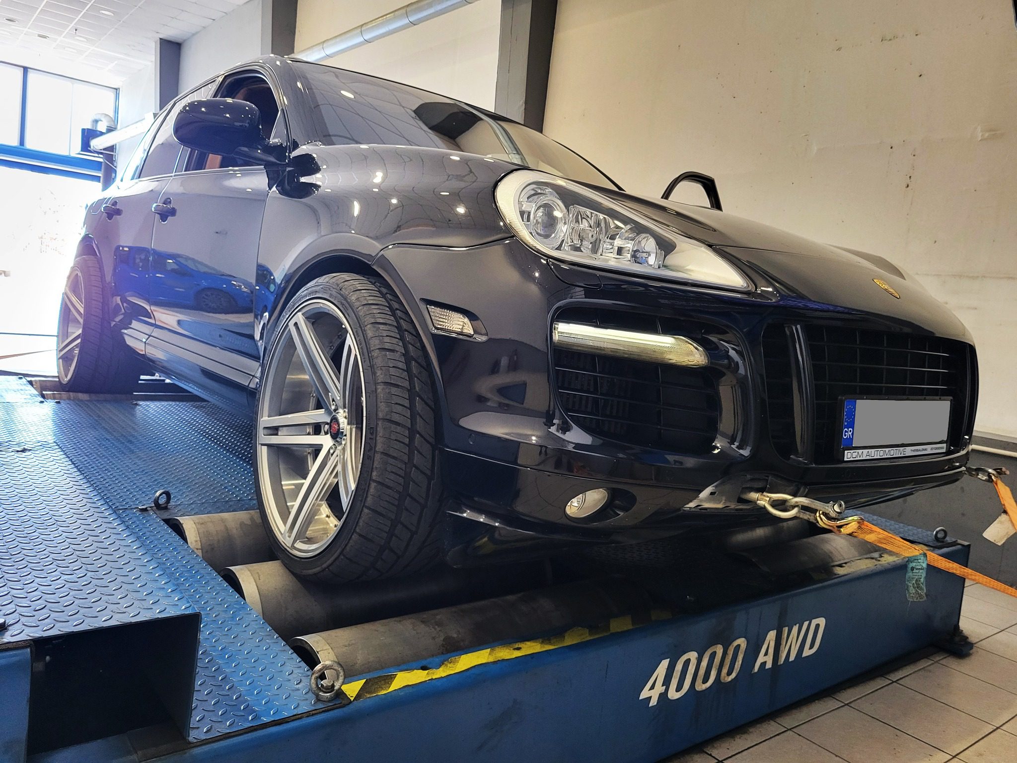 Το Porsche φοράει το κλασσικό πλέον 4.500 κυβικών Twinturbo V8 κινητήρα των 450 εργοστασιακών ίππων, ενώ είναι τετρακίνητο και αυτόματο Tiptronic S. Πρόκειται για πλήρως εργοστασιακό σκάφος με προσθήκη Turbo απο το Turbo “S” μοντέλο με εργοστασιακή παροχή 521 ίππων. Ήταν ήδη προγραμματισμένο, αλλά δεν απέδωσε πάνω απο 510 ίππους, έτσι το ξεκινήσαμε απο την αρχή με γνώμονα την 100% αξιοπιστία, παρά τα απόλυτα νου΄μερα. Με πολύ safe προγραμματισμό στο δυναμόμετρο, φτάσαμε 580 ίππους με θεαματική ροπή στα 701 Νm, με πολύ ασφάλεια και όλες τις δικλείδες ενεργοποιημένες, για να κάνει ο ιδιοκτήτης πολλά ακόμα απροβλημάτιστα χιλιόμετρα.