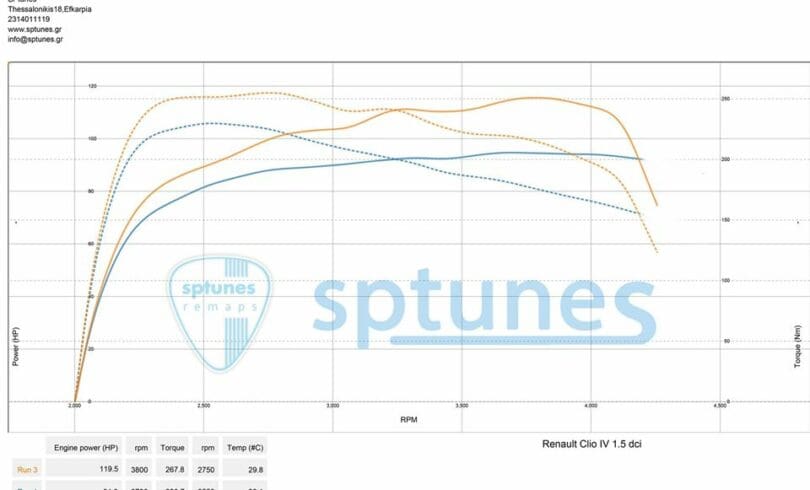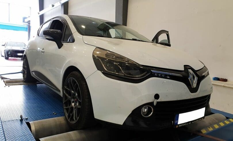 Renault Clio IV 1.5 Dci (K9K) custom dyno remap 90 ps ——> 119 ps 220 Nm ——> 268 Nm optimised for regular diesel Το γνωστό K9K 1.5 Dci μοτέρ της Renault που το συναντάμε στα Nissan, Dacia, Mercedes. Το clio 1.5 Dci με το μικρό Turbo και τα 90 άλογα είναι η ίδια μηχανή με τα 75 άλογα με το μόνο που αλλάζει είναι η χαρτογράφηση. Ετσι και τα 2 πηγαίνουν στα 120 άλογα περίπου μόνο με προγραμματισμό. Στη μεγαλύτερη έκδοση του 1.5 Dci με τα 109 και 110 άλογα φτάνουμε τα 135 άλογα περίπου.