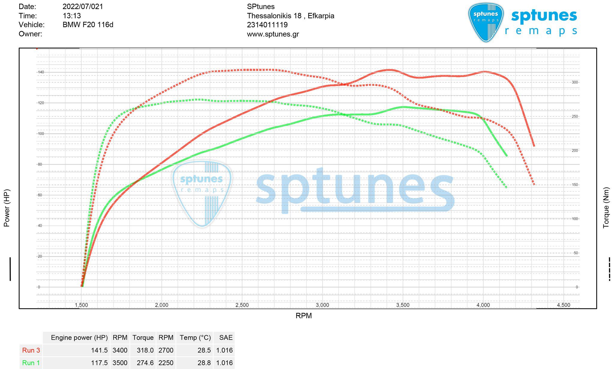Άλλο ένα BMW μας προτίμησε για προγραμματισμό αυτή τη φορά F20 LCI 116d με το 3 κύλινδρο 1.5 B37 diesel κινητήρα και τους 116 ίππους που συναντάμε κ στα Mini! Να υπενθυμίσουμε οτι το 114d με το 116d μοιράζονται ακριβώς τον ίδιο κινητήρα, έτσι φτάνουμε τα 140+ άλογα μόνο με προγραμματισμό και στα 2 μοντέλα! Αφού έγινε προέλεγχος για τη σωστή λειτουργία του κινητήρα και το φίλτρο μικροσωματιδίων DPF, το δυναμομετρήσαμε εργοστασιακό στα 117.5 άλογα, υγειέστατο! Μετά τον προγραμματισμό φτάσαμε τους 142 ίππους και άφθονη ροπή 318 Nm στο peak της! Απόλυτα ασφάλεια για καθημερινή χρήση, χαμηλό πυρόμετρο, χωρίς “πετσόκομα” στις δικλείδες ασφαλείας.
