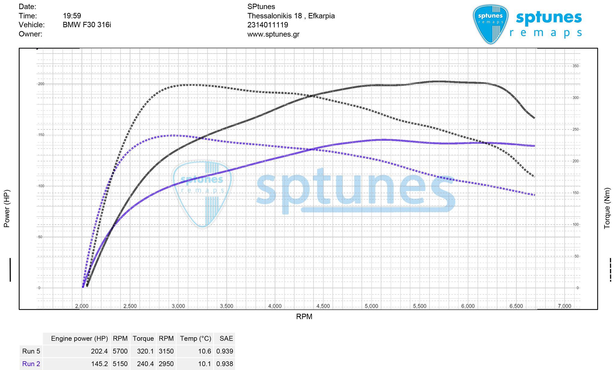 Άλλο ένα F-series για προγραμματισμό, αυτή τη φορά 316i με τον 1.6 Turbo κινητήρα, ο οποίος συναντάται σε παραλλαγές στα Mini Cooper S αλλά και σε Peugeot/Citroen! Όπως έχουμε ξαναπεί o Ν13Β16 κινητήρας βγαίνει και σε έκδοση με 170 ps εξού και η πολύ μεγάλη αύξηση της ιπποδύναμης. Εξελίξαμε εδώ και πολλά χρόνια απο 1ο στάδιο μέχρι και υβρίδια Turbo setup στα συγκεκριμένα μοτέρ!Αφού έγινε προέλεγχος για τη σωστή λειτουργία του κινητήρα προχωρήσαμε στον προγραμματισμό επάνω στο δυναμόμετρο. Το BMW ρυθμίστηκε για να μπορεί να κάνει και χρήση απλής 95 Ron βενζίνης και χωρίς καθόλου να το πιέσουμε, απ έδωσε 202 ίππους με άφθονη ροπή 320 Nm σε όλο το φάσμα πάνω απο την εργοστασιακή καμπύλη! Τέλος προστέθηκαν pops and bangs στο άφημα του γκαζιού και διορθώθηκε το sport display για τα νέα δεδομένα ιπποδύναμης/ροπής!