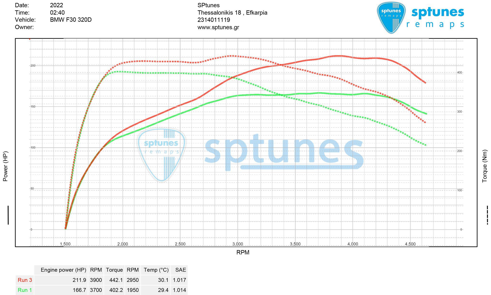 Έχουμε κάνει αμέτρητα N47 και B47 Diesel μοτέρ στα BMW με πολύ καλά αποτελέσματα μιας και είναι απο τα πιο αξιόπιστα στον χώρο! Αυτή τη φορά έχουμε ένα όμορφο 320d Effecient Dynamics αυτόματο με τον Ν47 κινητήρα και τους 163 εργοστασιακούς ίππους! Το συγκεκριμένο μοντέλο βγαίνει με 163 και 184 ονομαστικούς ίππους ενώ πρόκειται για τον ίδιο ακριβώς κινητήρα, αλλά με άλλη χαρτογράφηση! Έτσι και τα 2 μοντέλα φτάνουν τους 210+ ίππους με προγραμματισμό. Εργοστασιακό δυναμομετρήθηκε στους 166.7 ίππους και 402 Nm ροπής και αφού διαπιστώσαμε ότι είναι πλήρως λειτουργικό προχωρήσαμε στον custom προγραμματισμό στο δυναμόμετρο! Τελικό αποτέλεσμα οι 212 ίππους με άφθονη ροπή 442 Nm! Να σημειώσουμε οτι τα πυρόμετρα δουλεύουν κανονικά, οι δικλείδες ασφαλείας επίσης και έχουμε μηδενική “κάπνα” κατά το πάτημα.