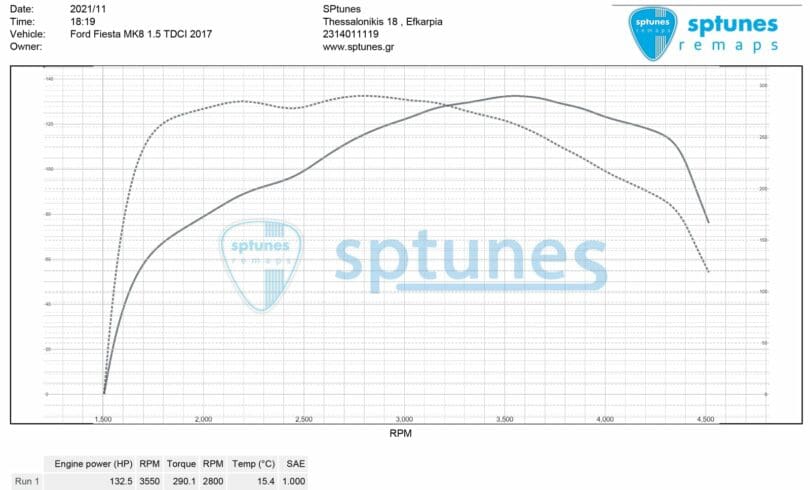 Ford Fiesta MK8 1.5 TDCI 85 ps custom dyno remap 100% stock 85 ps ———> 133 ps 215 Nm ——> 290 Nm Προγραμματίσαμε άλλο ένα 1.5 TDCI μοτέρ της Ford. Το 1.5 TDCI με τα 85 άλογα, έχει μικρότερο Turbo απο το αντίστοιχο με τα 120. Με έναν σωστό προγραμματισμό όμως οι επιδόσεις του ξεπερνούν το 120άρι και δεν έχει να ζηλέψει κάτι πλέον απο αυτό. Έτσι και έγινε μιας και το Fiesta έγραψε σχεδόν 133 άλογα με τη ροπή να φτάνει τα 290 Nm!