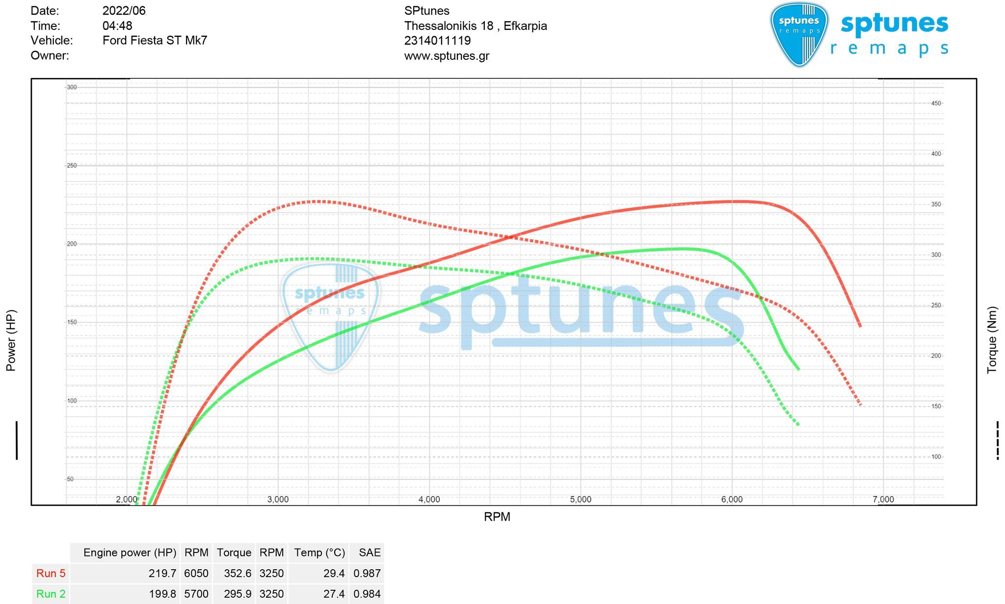Κάτι ξέρουμε απο ecoboost τόσα χρόνια, έτσι ένα ακόμα ST MK7.5 ήρθε για προγραμματισμό μιας και έχουμε κάνει πολλά απο 1ο στάδιο μέχρι και υβρίδια setup. Tο όμορφο Fiesta ST MK7.5 είναι πλήρως εργοστασιακό με μόνη προσθήκη downpipe και εξάτμισης μέχρι πίσω με πιο ελεύθερο αγωνιστικό καταλύτη 200cpi. Στον προέλεγχο όλα ήταν άψογα και το ST με τα περιφερειακά που φορούσε απέδωσε 199.8 ίππους με 296 Nm ροπή, οπότε και ξέραμε οτι θα πάμε καλά! Μετά τον προγραμματισμό, παρά τις αντίξοες συνθήκες θερμοκρασίας αλλά και υγρασίας, φτάσαμε αισίως στους 219.7 ίππους με άφθονη απο χαμηλά πλέον ροπή 353 Nm!