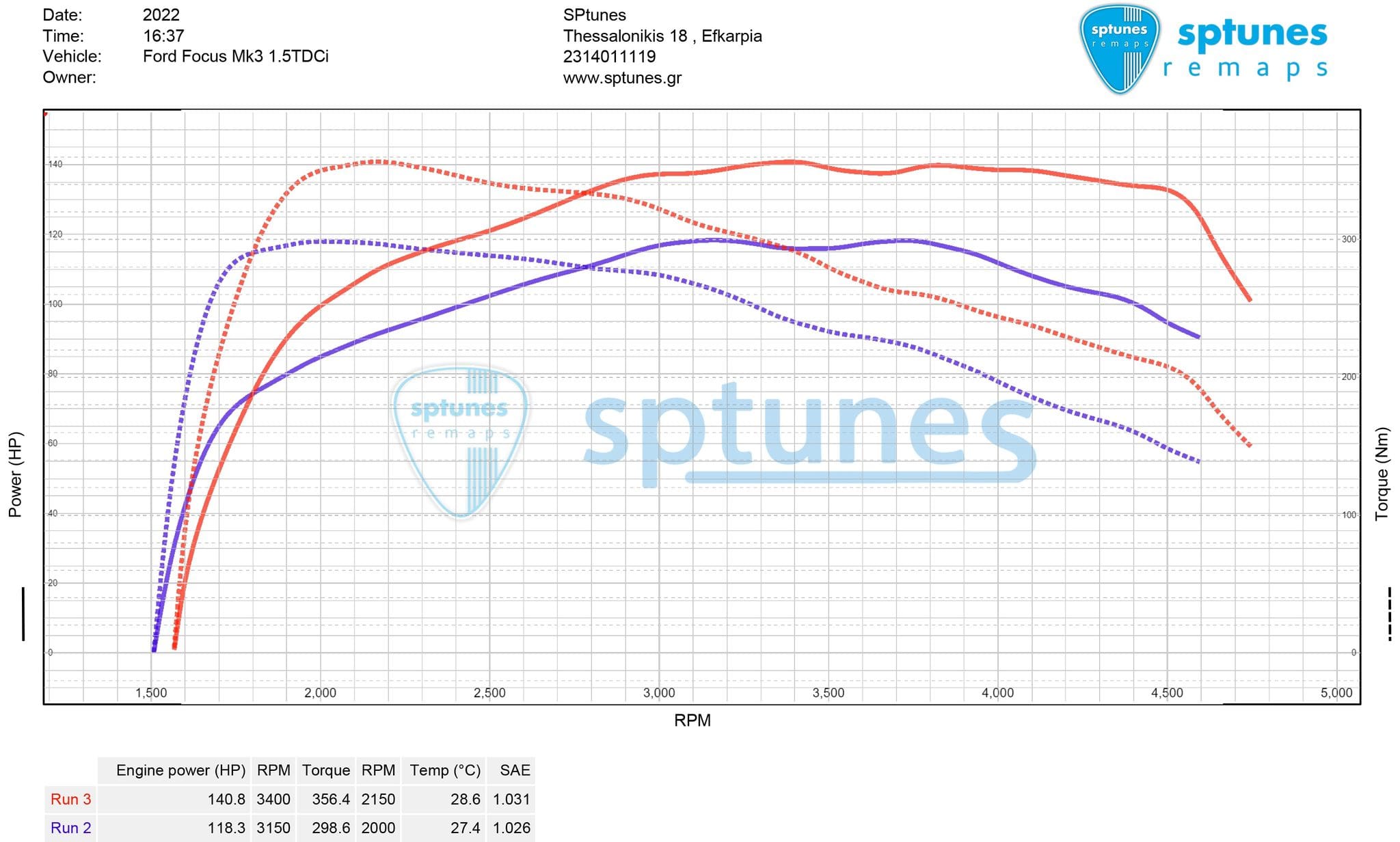 Τα TDCI και Ecoboost είναι το φόρτε μας μιας και έχουμε κάνει απο 1ο στάδιο μέχρι και πλήρως custom setup! Έχουμε κάνει αμέτρητα 1.5 TDCI σε Focus/Fiesta/Mondeo/Connect, έτσι και μας προτίμησε ο ιδιοκτήτης του Ford. Αυτή τη φορά προγραμματίσαμε άλλο ένα 1.5 TDCI Focus με την έκδοση των 120 ίππων. Στο συγκεκριμένο Focus βρήκαμε ελαφρώς βουλωμένο dpf στον προέλεγχο και μετρήθηκε στα 118 άλογα με 299 Nm ροπής! Προγραμματίστηκε στο δυναμόμετρο με γνώμονα την αξιοπιστία και την πλήρως εργοστασιακή λειτουργία. Τελικό αποτέλεσμα, 141 άλογα με πολύ καλή ροπή στα 356 Nm, πάντα με ασφάλεια στο φίλτρο μικροσωματιδίων DPF, χωρίς ακρότητες, με τις δικλείδες ασφαλείας όλες ενεργοποιημένες!