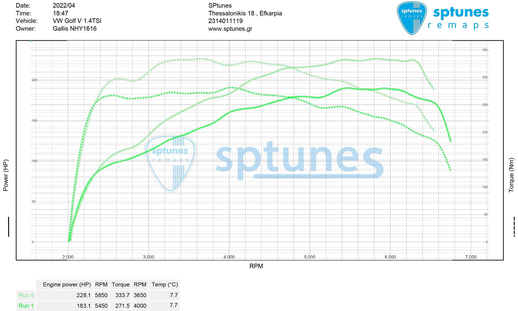 1.4 TSI και πάλι! Το Twincharged Turbo-Compressor BMY/BLG κινητήρα, τον έχουμε κάνει απο 1ο στάδιο μέχρι και fully custom setup. Το συγκεκριμένο Golf είναι εργοστασιακό με περιφερειακά 1ου σταδίου: εξάτμιση απο το downpipe μέχρι πίσω και εισαγωγή ενώ η διαχείριση της πίεσης γίνεται απο την εργοστασιακή ηλεκτροβαλβίδα Ν75! Μετά απο αρκετά runs και full custom προγραμματισμό, φτάσαμε Safe στους 232 ίππους με peak ροπής 331 Nm!