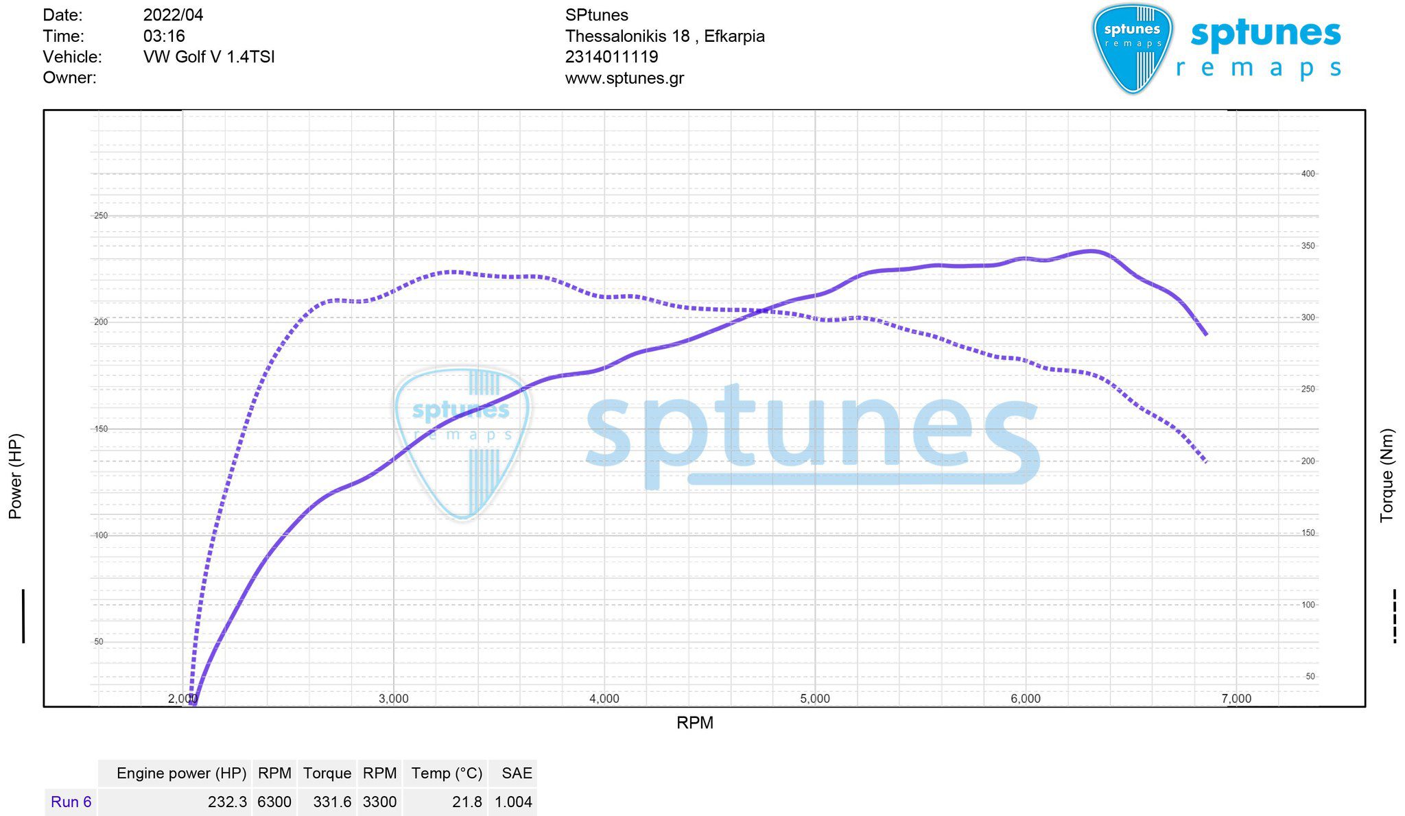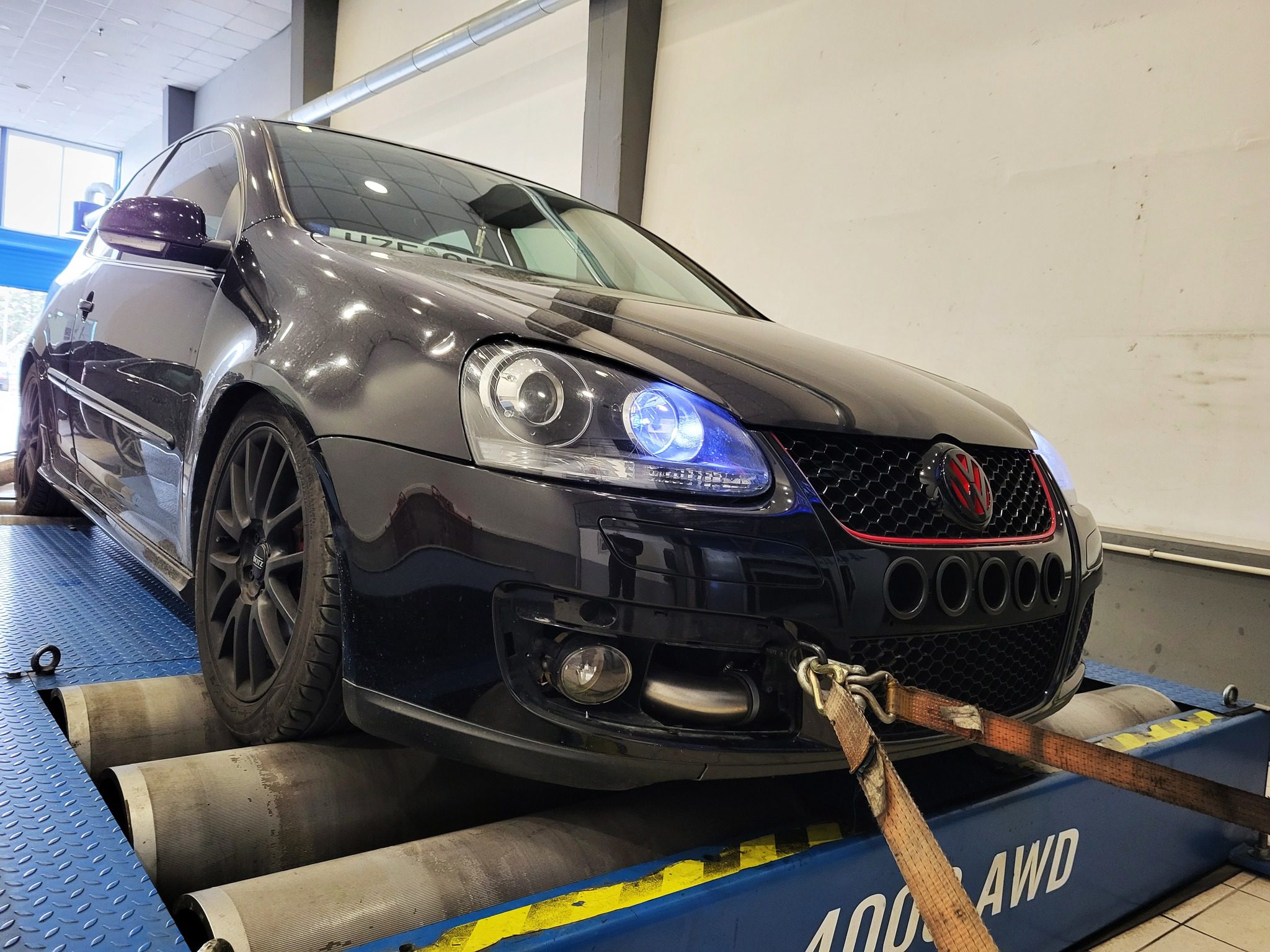 1.4 TSI και πάλι! Έχουν την τιμιτική τους και κάνουμε πολλά! Το Twincharged Turbo-Compressor BMY/BLG κινητήρα, τον έχουμε κάνει απο 1ο στάδιο μέχρι και fully custom setup. Το συγκεκριμένο Golf είναι GT εργοστασιακό με περιφερειακά 2ου σταδίου: εξάτμιση απο το downpipe μέχρι πίσω, εισαγωγή και intercooler, ενώ κάνει χρήση 100 ron βενζίνης! Eνώ η διαχείριση της πίεσης γίνεται απο την εργοστασιακή ηλεκτροβαλβίδα Ν75! Μετά απο αρκετά runs και full custom προγραμματισμό, φτάσαμε Safe στους 232 ίππους με peak ροπής 332 Nm!