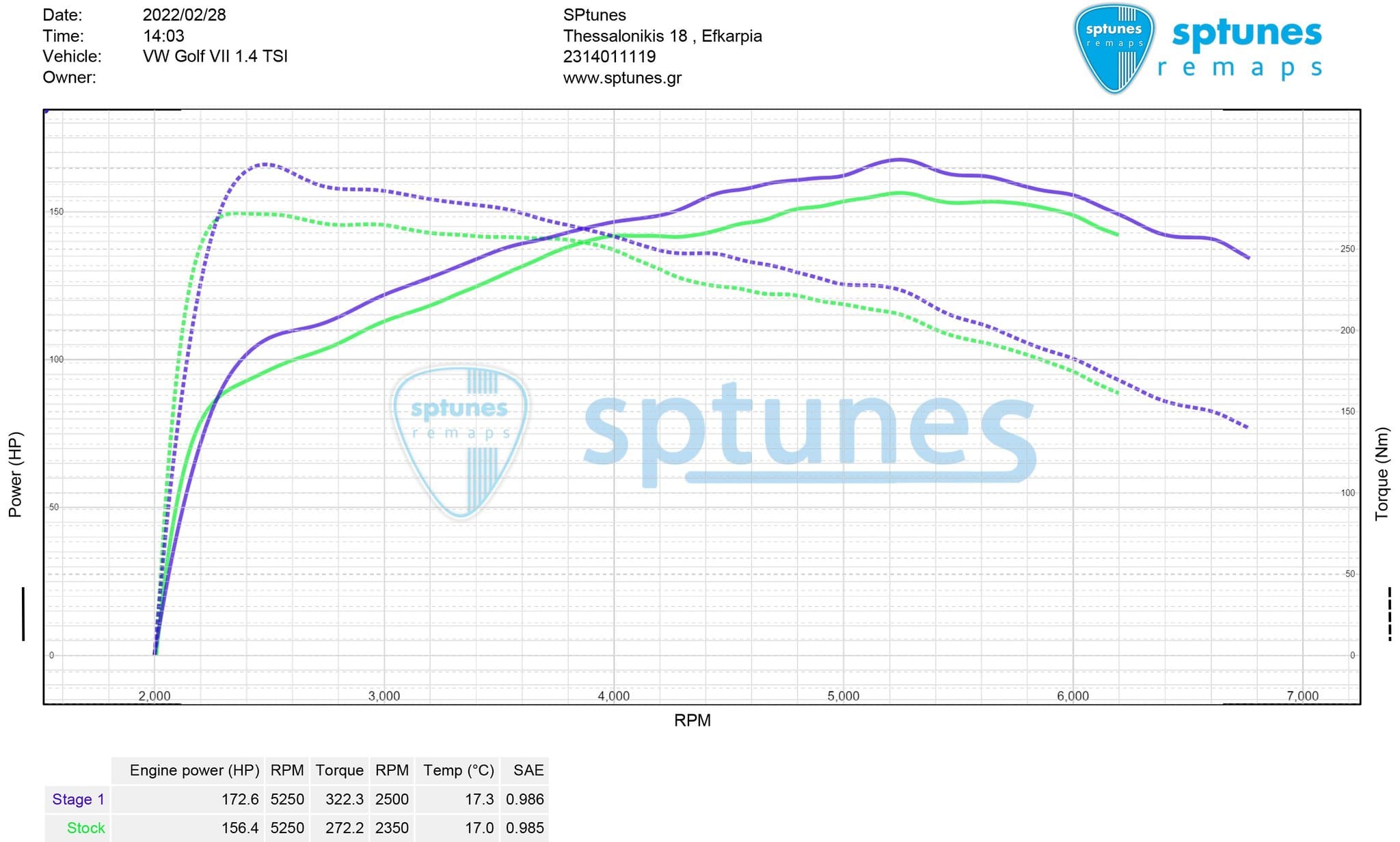 Το όμορφο Golf φοράει τον EA211 1.4 TSI κινητήρα -με ACT mode. Το ACT mode επιτρέπει απενεργοποίηση 2 κυλίνδρων για μείωση κατανάλωσης! Έχουμε κάνει και ανεβάσει πολλά ACT μοτέρ μέχρι 2ο στάδιο και ετοιμαζόμαστε για υβρίδιο Turbo! Ο σωστός προγραμματισμός είναι αναγκαίος μιας και έχουμε δει “πετσοκόμμα” του συστήματος απο συναδέλφους ή κακή διαχείρηση καυσίμου! Μετρήθηκε εργοστασιακό στους 156 ίππους με υγειέστατες μετρήσεις και προχωρήσαμε στον προγραμματισμό. Χωρίς να το πιέσουμε καθόλου έφτασε στα 173 άλογα με ροπή που εντυπωσιάζει χαμηλομεσαία, με μέγιστη τιμή 322 Nm από τα 272 Nm που είχε πριν.