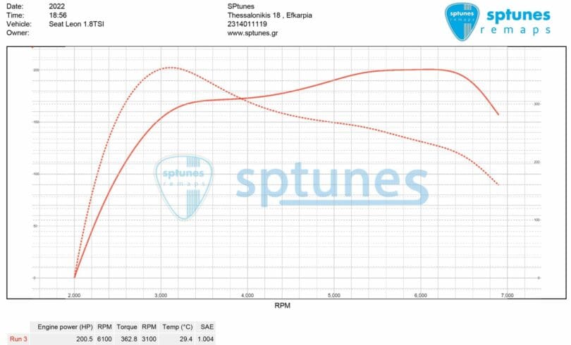 Το Leon φοράει τον γνωστό 1.8 TSI μοτέρ CDA. Τα 1.8 TSI/TFSI τα έχουμε εξελίξει απο 1ο στάδιο μέχρι big turbo setup. Πλήρως εργοστασιακό, ρυθμίστηκε απο την αρχή στο δυναμόμετρο με γνώμονα την ασφάλεια αλλά και την αξιοπιστία. Τελικό αποτέλεσμα 201 ίπποι με 363 Nm ροπής χαμηλά στο overboost! Σύντομα με ελεύθερη εξάτμιση και εισαγωγή θα μπορέσει να ανέβει +35 χοντρικά άλογα σε όλο το φάσμα.
