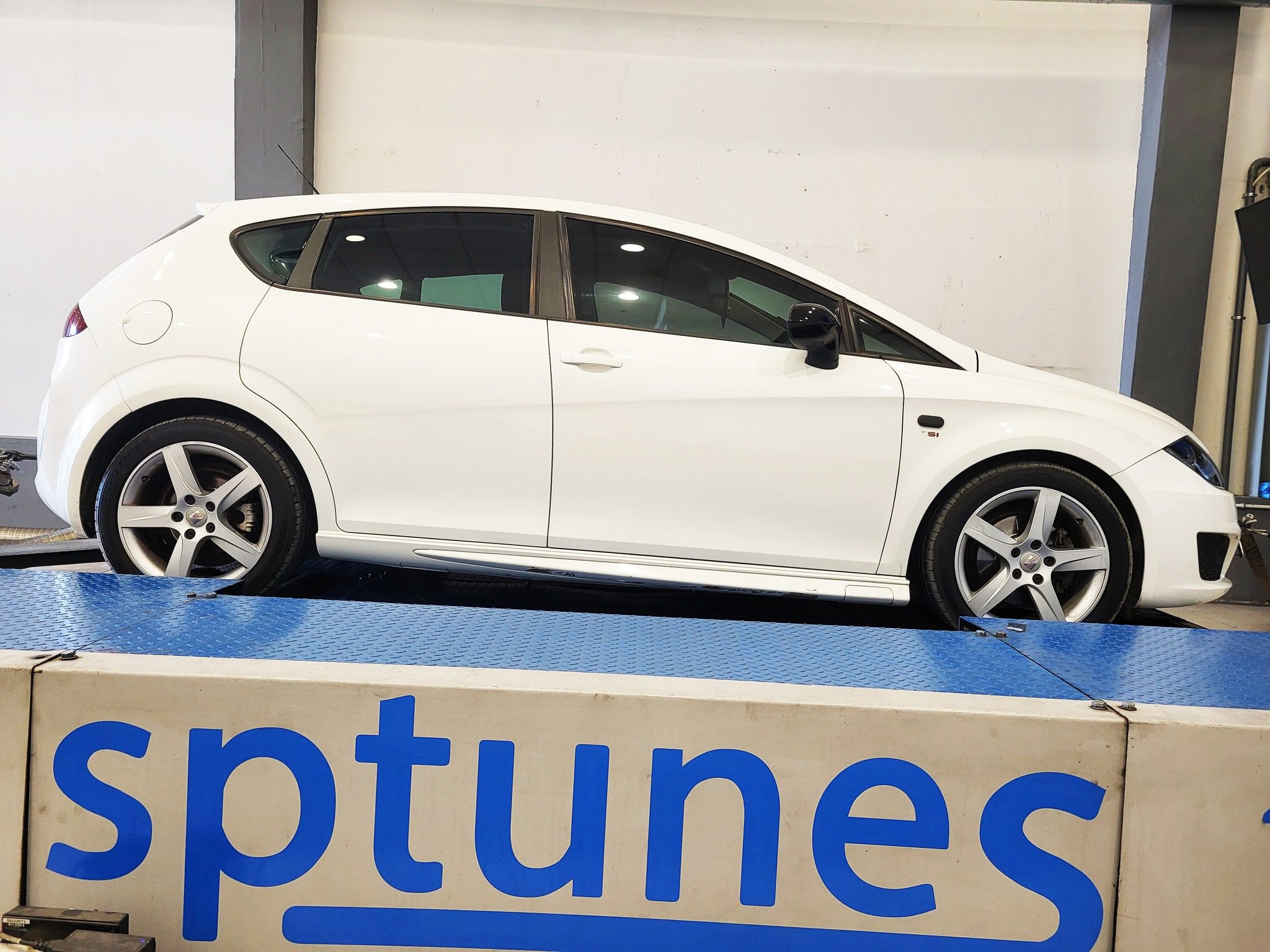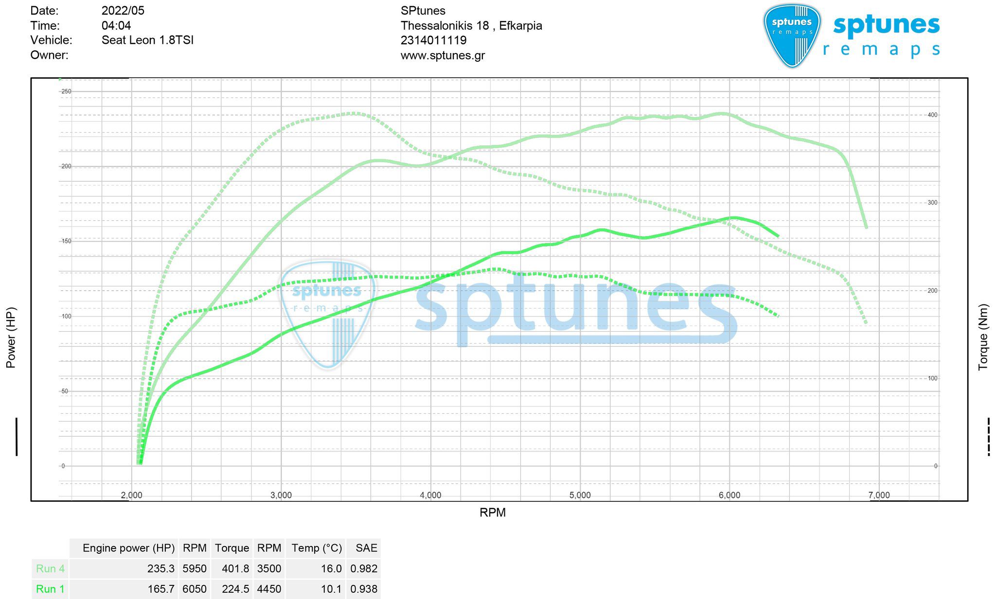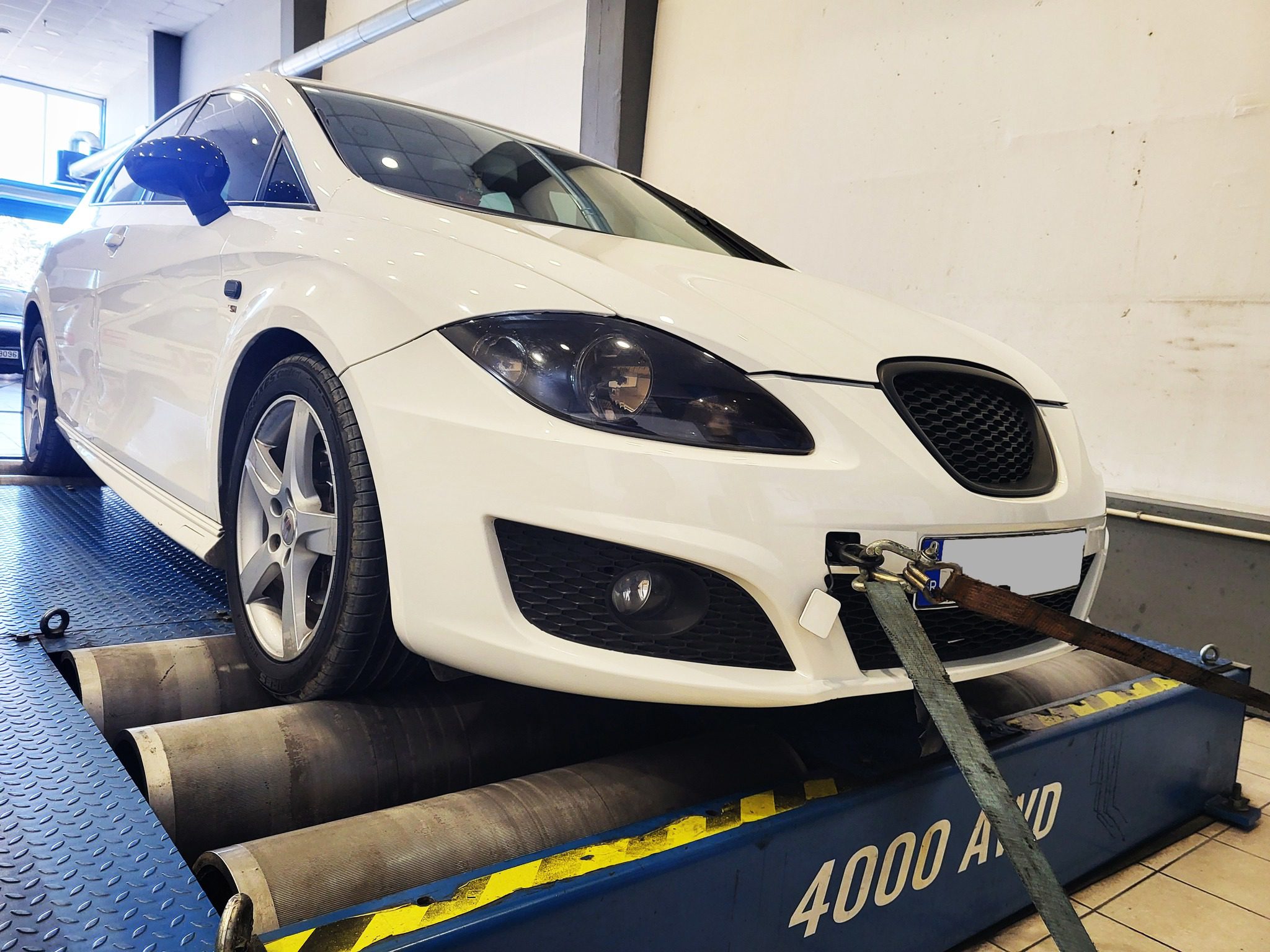 Το Leon φοράει τον 1.8 TSI/TFSI EA888 κινητήρα CDA με καδένα, ένα μοτέρ που γνωρίζουμε καλά! Οι δυνατότητές του πολλές και έχουμε εξελίξει τα BZB/CDA απο 1ο στάδιο Κ04064 ή και big turbo setup! Με περιφερειακά 2ου σταδίου, όπως εξάτμιση και εισαγωγή ανέβηκε στο δυναμόμετρο να το προγραμματίσουμε! Στον προέλεγχο με καλά logs διαπιστώσαμε απόκλιση πίεσης, φαινόταν οτι απο κάπου “χάνει” το μοτέρ στη πίεση. Αλλάχθηκε η σκάστρα, που είναι ο συνήθης ύποπτος με τη μεμβράνη να τρυπάει και συνεχίσαμε κανονικά, με το Leon να αποδίδει 235 ίππους με εντυπωσιακή ροπή 402 Nm και όλα αυτά με χρήση απλής 95 Ron βενζίνης.