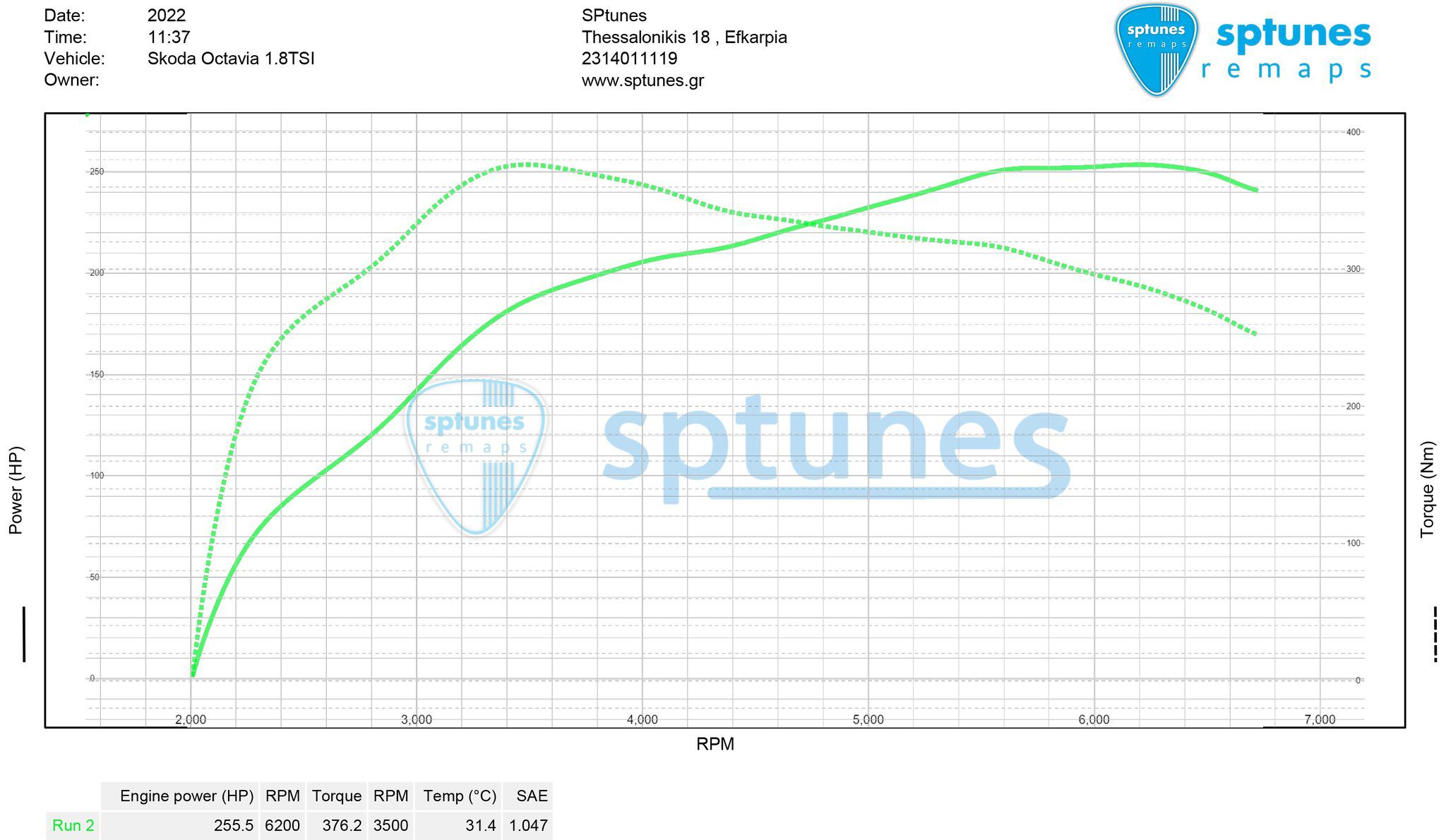 Άλλο ένα παράδειγμα πραγματικού custom προγραμματισμού, σε ένα setup πλήρως εργοστασιακό, αλλά με μεγάλο Turbo! Το Octavia φοράει τον 1.8 TSI/TFSI EA888 κινητήρα CDA με καδένα! Οι δυνατότητές του πολλές και έχουμε εξελίξει τα BZB/CDA απο 1ο στάδιο Κ04064 ή και big turbo setup! Το εργοστασιακό κατά τα άλλα Octavia φόρεσε Κ04064 Turbo, ενώ κατά τα άλλα είναι 100% εργοστασιακό, ακόμα και με μαμά φίλτρο! Την πίεση του Turbo διαχειρίζεται η Ν75 με στόχο την καθημερινή απροβλημάτιστη λειτουργία! Με μόλις 1.1 bar πίεση το Octavia έβγαλε 256 ίππους με ροπή 376 Nm! Φτάνουμε τέτοια Setup στα 300+ άλογα μόνο με περιφερειακά, κάτι που γνωίζει ο ιδιοκτήτης και σύντομα θα μπει downpipe και φουλ εξάτμιση!
