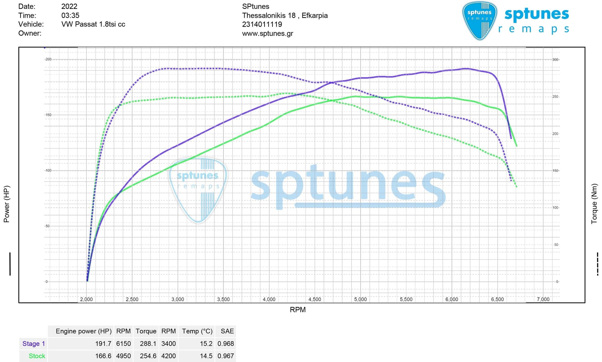 Το 1.8 TSI Passat φοράει φοράει το BZB μοτέρ, τον προκάτοχο του CDA, πρόκειται για γενιά EA888 με καδένα και πολλές δυνατότητες. Τα συγκεκριμένα μοτέρ τα έχουμε κάνει απο 1ο στάδιο μέχρι και ΙΗΙ ή K04 setup με πολύ καλά αποτελέσματα και αξιοπιστία! Αφού έγινε προέλεγχος και έβγαλε την εργοστασιακή του ιπποδύναμη, προγραμματίστηκε και το πλήρως εργοστασιακό Passat, έφτασε τους 192 ίππους με τη ροπή σταθερή σε όλο το φάσμα επάνω απο την εργοστασιακή με peak τα 288 Nm!
