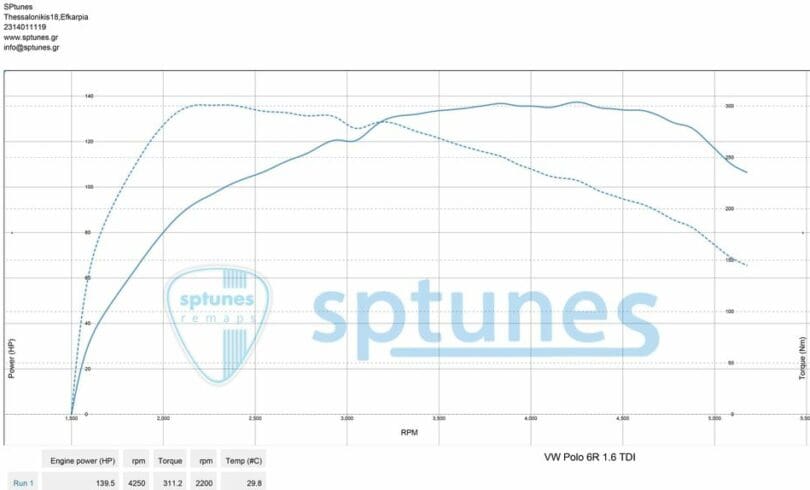 VW Polo 6R 1.6 TDI (CAYC) custom dyno remap throttle Response Speed Limiter Removal 105 ps —–> 140 ps 245 Nm —-> 311 Nm Το 1.6 TDI CAY μοτέρ της VW, το έχουμε ανεβάσει πολλές φορές μιας και το χρησιμοποιούν από μικρά Hatch, μέχρι μεγάλα επαγγελματικά του ομίλου. Θεωρείται από τα πλέον αξιόπιστα diesel μοτέρ VAG. Το Polo φοράει το CAYC μοτέρ με τα 105 άλογα. Πρόκειται για το ίδιο μοτέρ με τα CAYA/CAYB με 75 και 90 αντίστοιχα χωρίς καμία διαφορά. Το μικρό Polo πήγε στα 140 άλογα περίπου χωρίς καθόλου ζόρι με το DPF σχετικά καθαρό! Πλέον το αυτοκίνητο πάει πολύ καλύτερα σε όλο το φάσμα, με πολύ καλύτερη απόκριση γκαζιού και μειωμένη κατανάλωση στο 1 λίτρο κάτω όπως ενημερωθήκαμε αργότερα απο τον πελάτη.