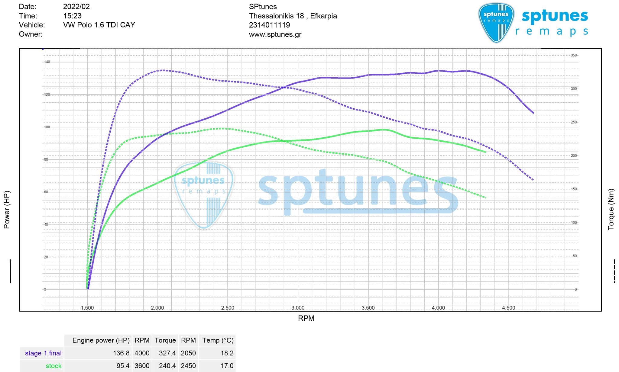 Το 1.6 TDI CAY μοτέρ της VW το έχουμε εξελίξει στο έπακρο τα τελευταία πολλά χρόνια, από πρώτο στάδιο μέχρι υβρίδια και Turbo απο 2.0 TDI, έχοντας καλύψει όλα τα setup! Το συγκεκριμένο Polo είναι πλήρως εργοστασιακό χωρίς καμία μετατροπή και είναι η έκδοση CAYB με τους 90 ίππους. Τοποθετήσαμε την τελευταία έκδοση λογισμικού για καλύτερη λειτουργία των μπεκ, EGR και αντλίας και προχωρήσαμε στον προγραμματισμό στο δυναμόμετρο. Όπως ξαναείπαμε η έκδοση με τους 90 ίππους είναι ίδια μηχανικά με τις εκδόσεις των 105 και 110 ίππων, έτσι το αποτέλεσμα με προγραμματισμό είναι θεαματικά μεγάλο! Τελικό αποτέλεσμα 137 ίππους με 327 Nm ροπής, το Polo πλέον κινείται πολύ πιο άνετα χωρίς θυσίες στη κατανάλωση!