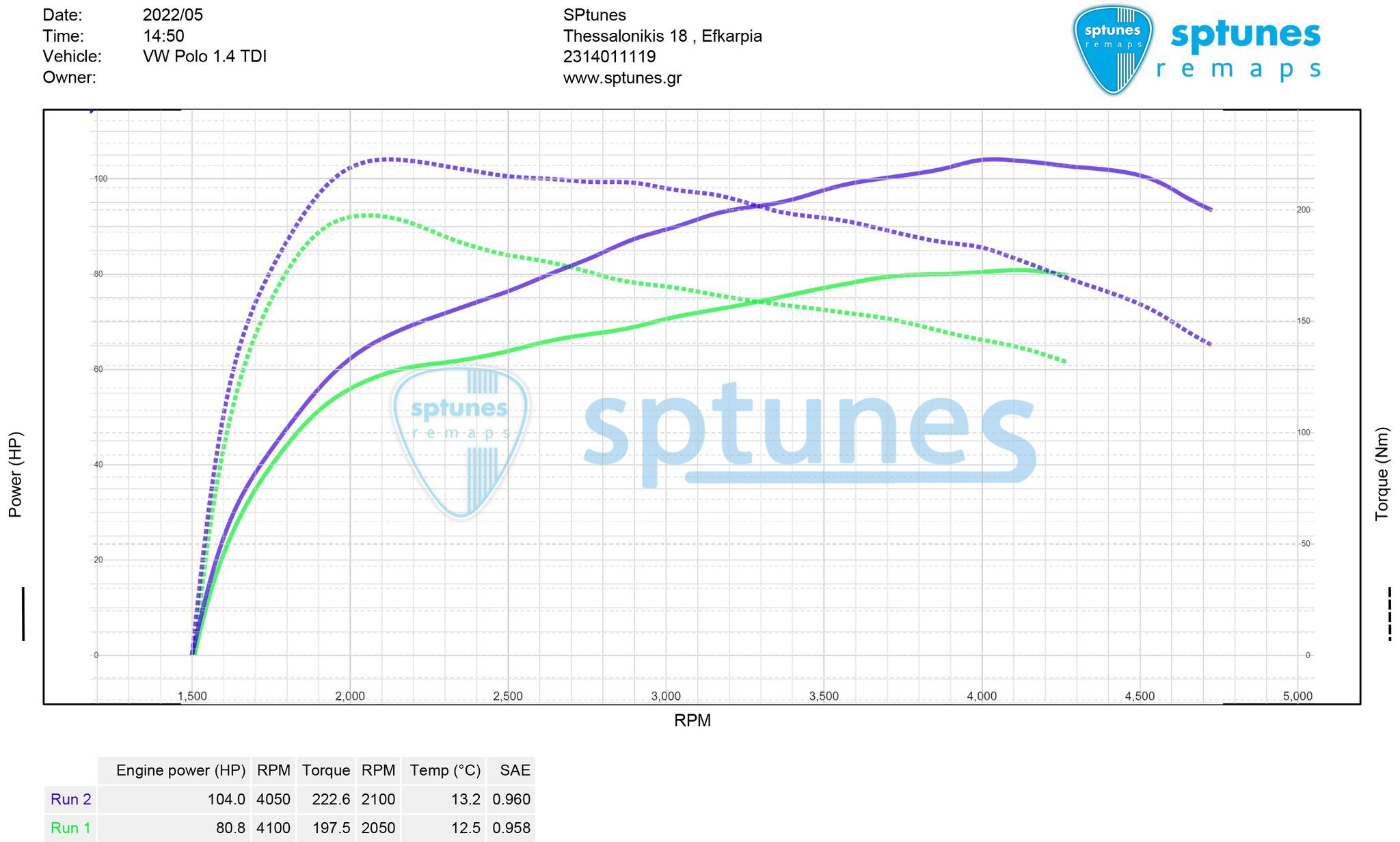 Το 1.2 TDI μοτέρ της VW το έχουμε εξελιξει -όπως και τα 1.4 και 1.6 TDI- για setup με υβριδικά Turbo ή big Turbo! Το συγκεκριμένο Polo είναι πλήρως εργοστασιακό με ελεύθερο downpipe, και είναι η έκδοση CFWA με τους 75 ίππους. Αφού κάναμε τον προέλεγχό και ελέγξαμε τη καλύτερη λειτουργία των μπεκ, EGR και αντλίας και προχωρήσαμε στον προγραμματισμό στο δυναμόμετρο. Τελικό αποτέλεσμα 104 ζωντανοί ίπποι με 223 Nm ροπής, θεαματικά πιο ψηλά σε όλο το διάγραμμα όπως φαίνεται! Το Polo πλέον κινείται πολύ πιο άνετα χωρίς θυσίες στη κατανάλωση!
