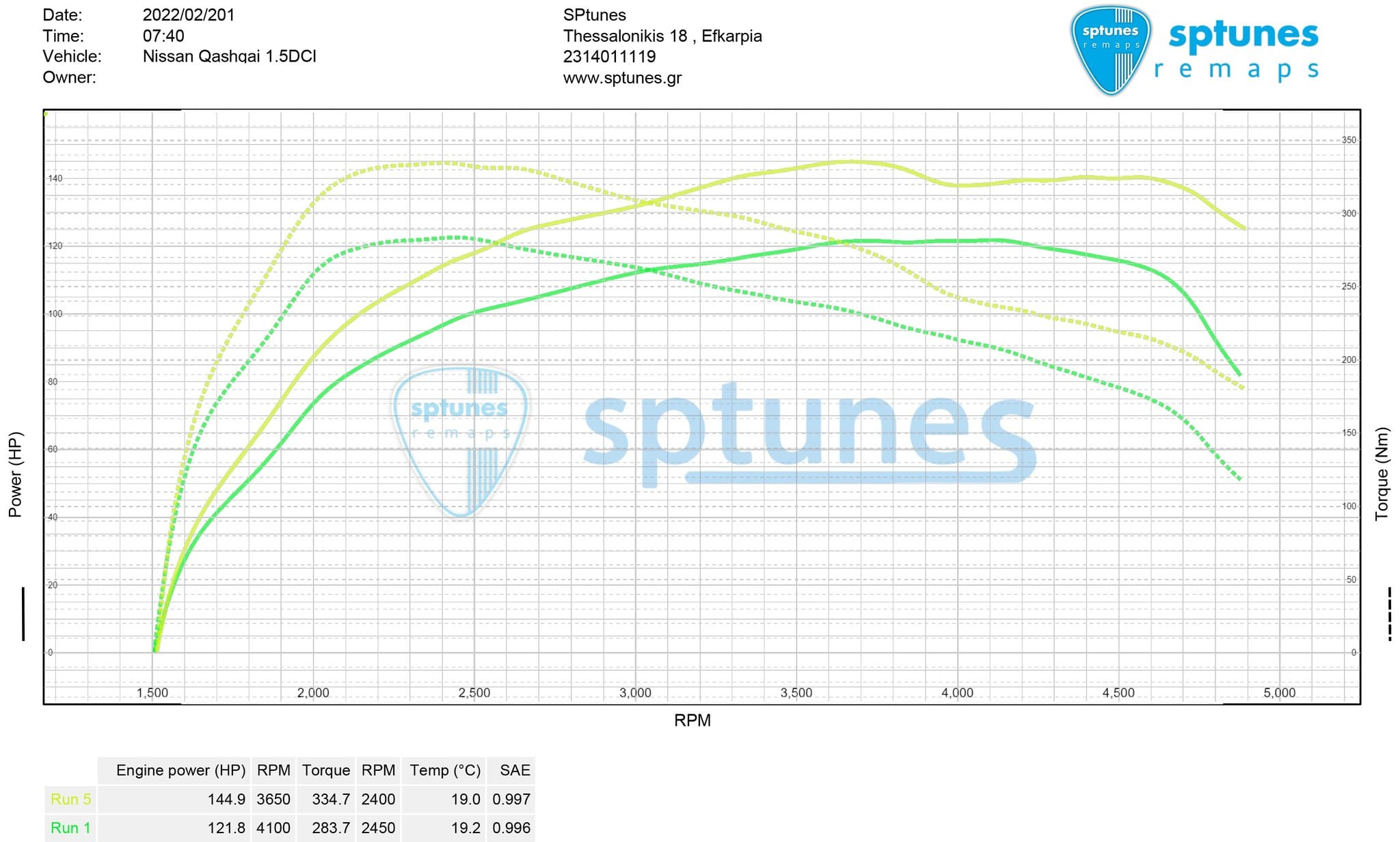 Το Nissan Qashqai εφοδιάζεται με τον 1500Diesel κινητήρα της Renault (K9K) που συνατάμε και στα Dacia και Mercedes. Tο συγκεκριμένο Qasqai είναι Facelift J11 BlueDCI με τον MG1 εγκέφαλο και μεγαλύτερο Turbo απο τα υπόλοιπα 1.5 DCI ,με τα 115 εργοστασιακά άλογα! Έγινε προέλεγχος στο δυναμόμετρο και βρήκαμε μηδενικό βούλωμα στο DPF, οπότε προχωρήσαμε και στον προγαμματισμό! Τελικό αποτέλεσμα εντυπωσιακό στους 145 ίππους με άφθονη ροπή 335 Nm!