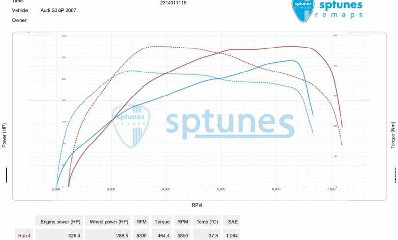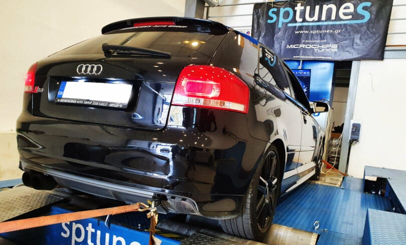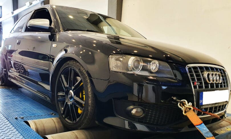 Το Audi S3 8P με την εργοστασιακή K04 αποδίδει πολύ καλά μόνο με προγραμματισμό. Το συγκεκριμένο φοράει εξάτμιση απο Downpipe και πίσω μια και εισαγωγή, με όλα τα υπόλοιπα πλήρως εργοστασιακά! Χωρίς να πιεστεί καθόλου με 38 βαθμούς περίπου μέσα στο καλοκαίρι, απέδωσε 326 άλογα με άφθονη ροπή στα 464 Nm, καθόλου άσχημα για πλήρως εργοστασιακό S3, χωρίς αντλία/μπρουτζάκι και παραπάνω περιφερειακά. Τέλος προτέθηκαν crackles /pops and bangs στο άφημα του γκαζιού σε ορισμένο φάσμα στροφών.