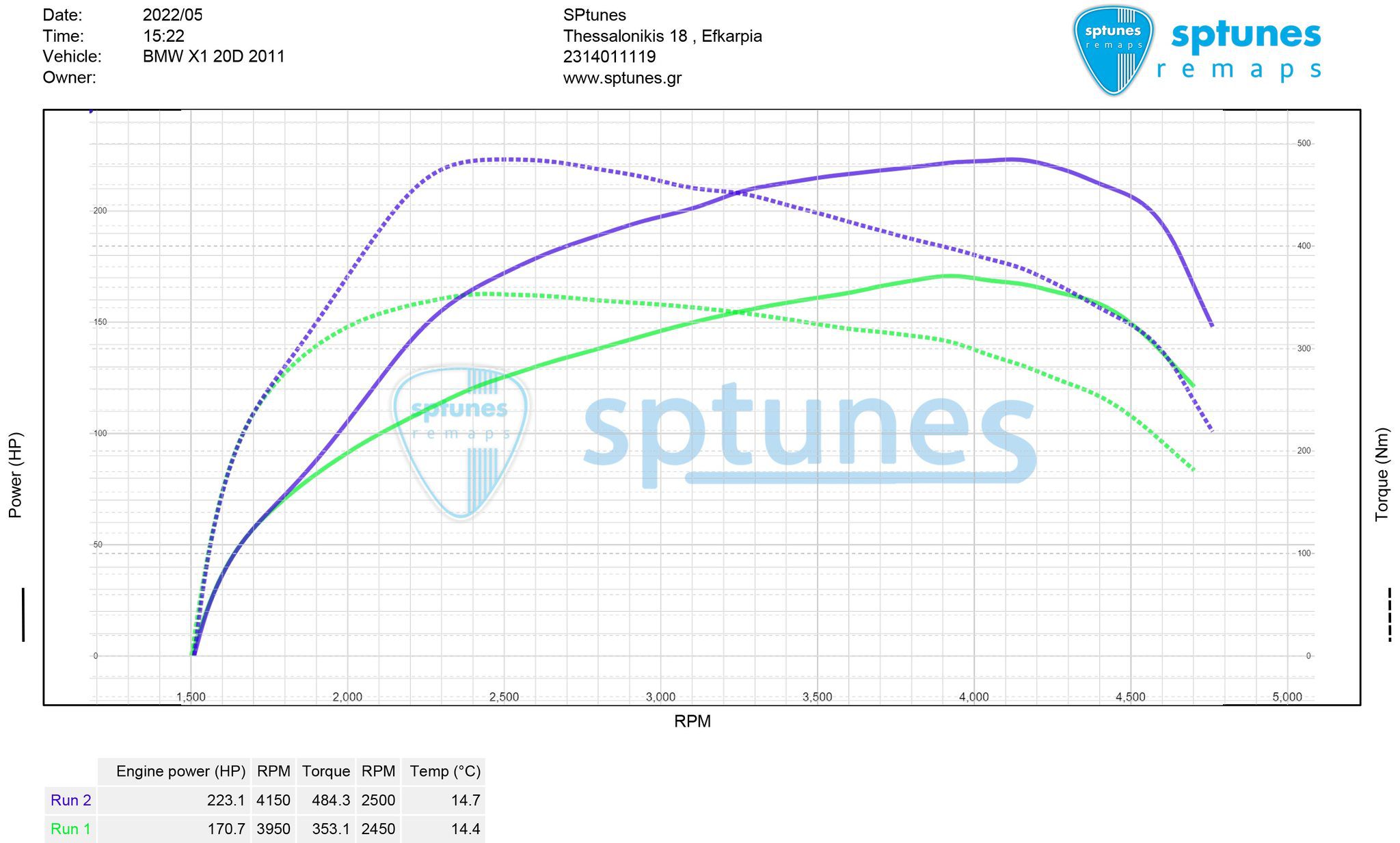 Έχουμε κάνει αμέτρητα N47 και B47 Diesel μοτέρ, απο 1ο στάδιο μέχρι και υβριδικά Turbo με μεγαλύτερα μπεκ και είναι απο τα πιο αξιόπιστα στον χώρο! Το συγκεκριμένο X1 E84 φέρει τον κινητήρα N47 με τους 177 εργοστασιακούς ίππους, ενώ είναι πλήρως εργοστασιακό. Αφού κάναμε προέλεγχο, δυναμομετρήθηκε εργοστασιακό στους 171 ίππους με 353 Nm ροπής, ενώ μετά τον προγραμματισμό φτάσαμε τους 223 ίππους με άφθονη πλέον ροπή 484 Nm! Να σημειώσουμε οτι τα πυρόμετρα δουλεύουν κανονικά, οι δικλείδες ασφαλείας επίσης και έχουμε μηδενική “κάπνα” κατά το πάτημα.